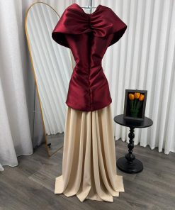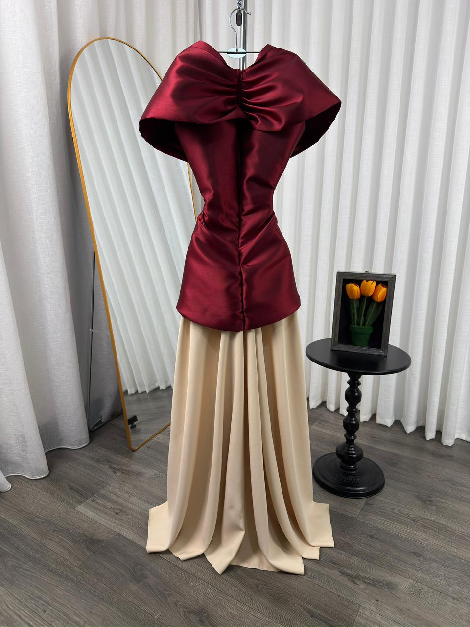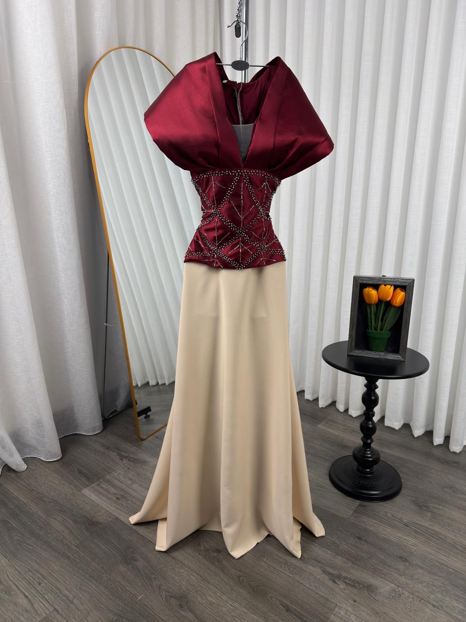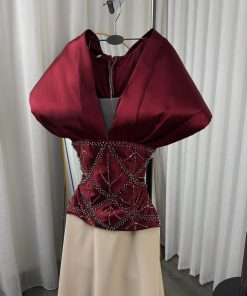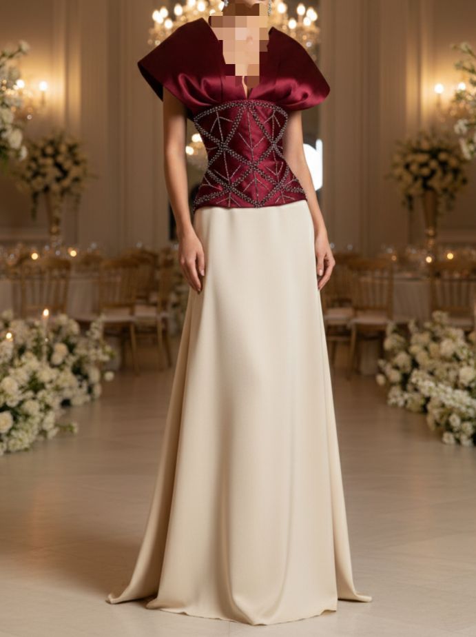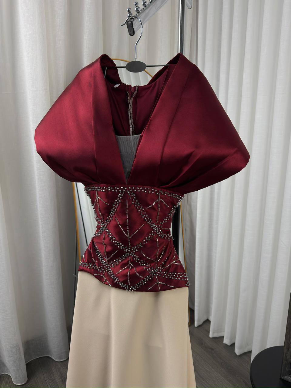 فستان سهرة فاخر بتصميم راقٍ يجمع بين الجزء العلوي باللون العنابي المطرز بالخرز اللامع وقصة كورسيه أنيقة، مع تنورة واسعة باللون البيج تضيف فخامة ونعومة لإطلالة ملكية في المناسبات الخاصة.