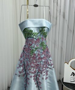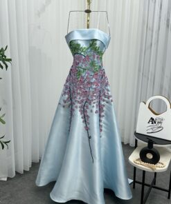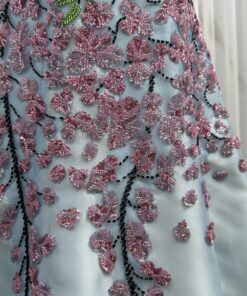 ما يميز الفستان بشكل خاص هو التطريز اليدوي الغني بالورود البنفسجية البارزة المتناثرة من الخصر وحتى الأسفل، والممزوجة بأوراق خضراء وتفاصيل دقيقة تضيف لمسة فنية مستوحاة من الطبيعة. التصميم مفعم بالأنوثة والرقي، ما يجعله خياراً مثالياً للمناسبات الفخمة أو حفلات الزفاف.