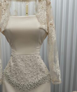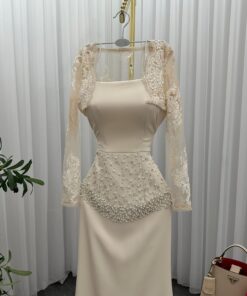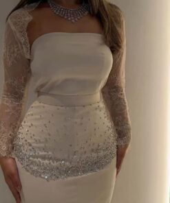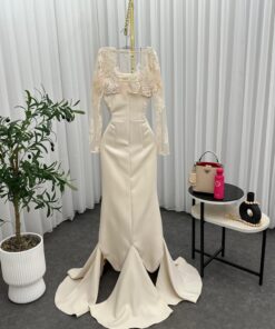 فستان سهرة أنيق بلون بيج هادئ، يتميز بتصميم ضيق يبرز القوام، وبقماش ناعم مزين بتطريز لامع عند الخصر يُضفي لمسة فخمة. الأكمام من الدانتيل الشفاف، ما يضيف أنوثة ورقي، وينتهي الفستان بقصة ذيل السمكة لمظهر راقٍ وجذاب.