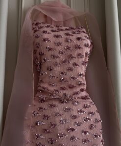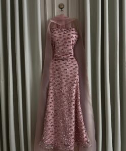 يتألق الفستان بلون وردي ناعم يعكس رقّة التفاصيل وبساطة الفخامة في آنٍ واحد. يتميز التصميم بقماش مطرز بالكامل بتفاصيل براقة تأتي على شكل عناصر دقيقة موزعة بانسجام، لتمنح الفستان إطلالة مفعمة بالضوء والأنوثة.