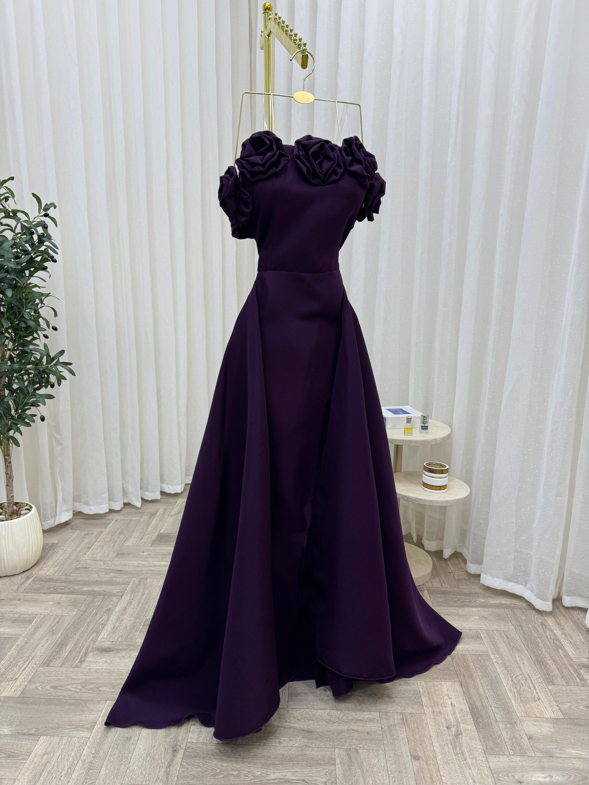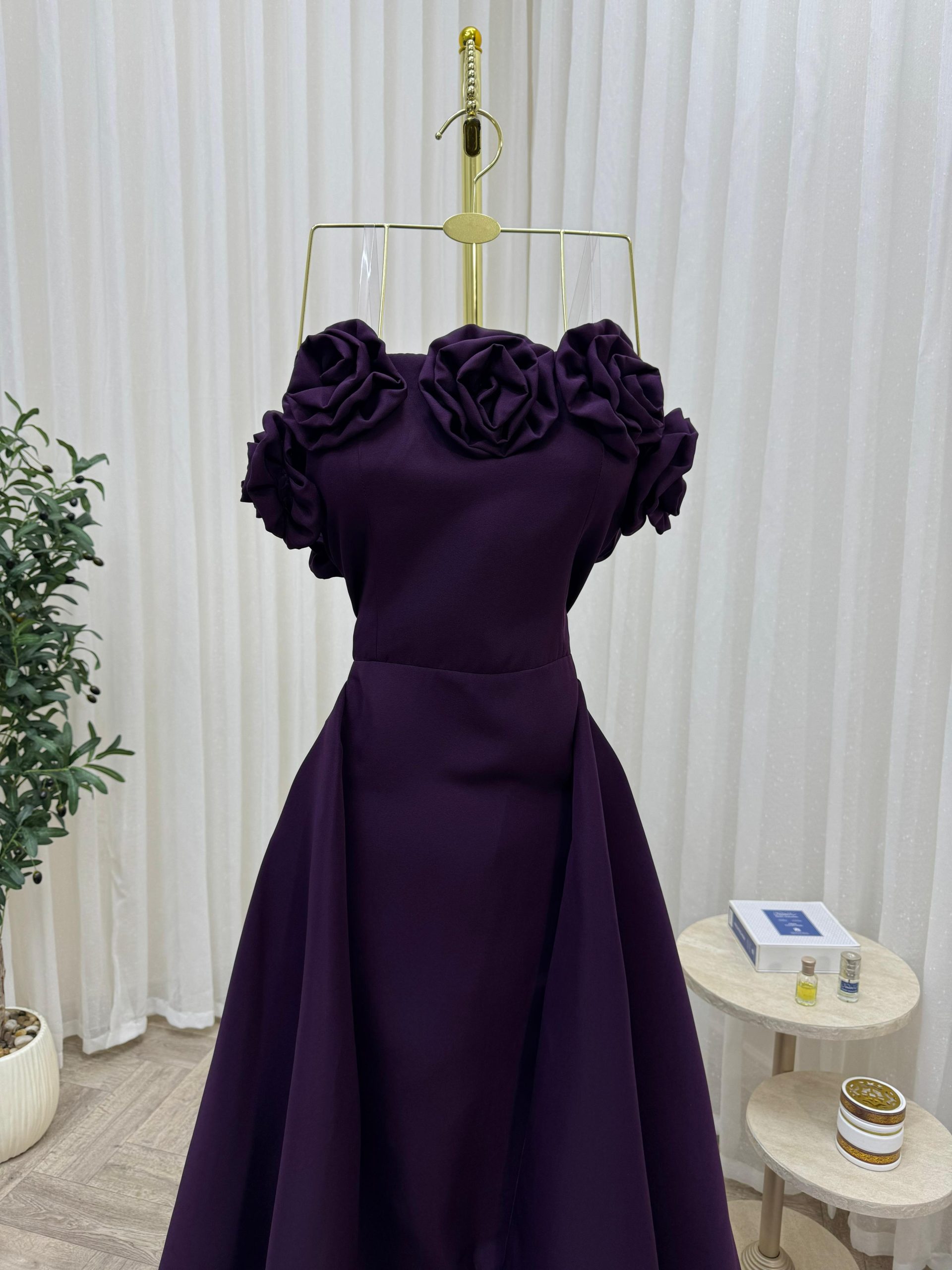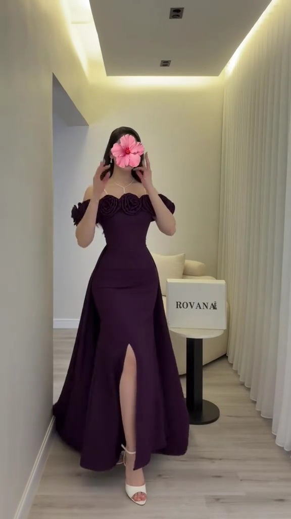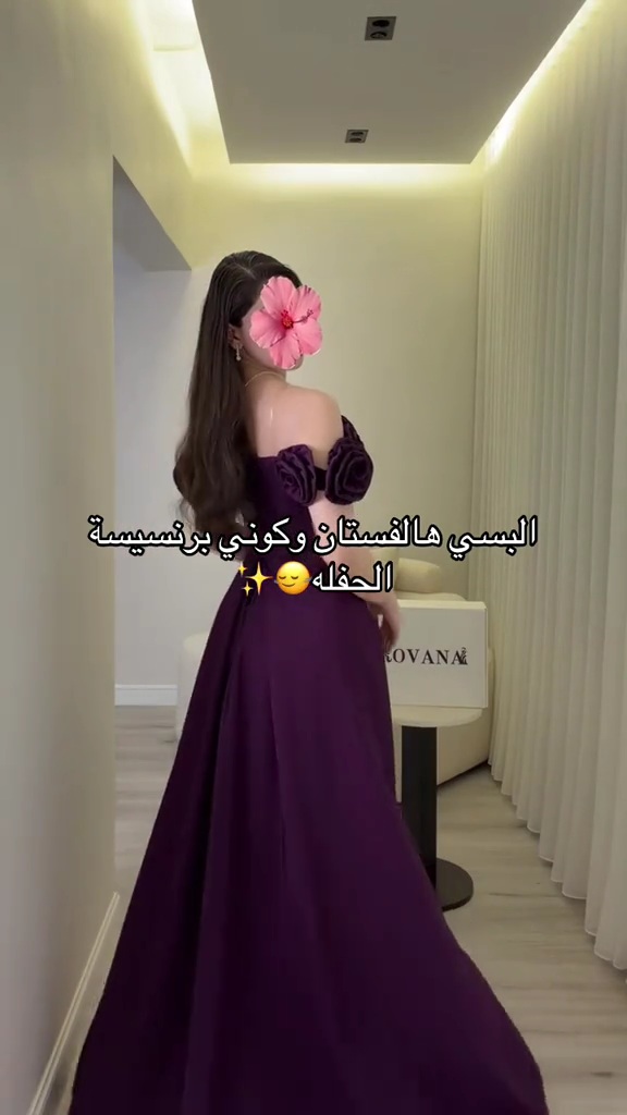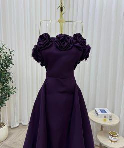 يتميز الفستان بتصميم علوي مزين بورود بارزة على الأكتاف تضيف لمسة فنية أنثوية فاخرة، مع قصة واسعة وانسيابية تمنحك حضورًا مميزًا وراحة مثالية أثناء الحركة. اللون البنفسجي الداكن يعكس الفخامة والرقي، ويُعد خيارًا مثاليًا للسهرات والمناسبات الرسمية.