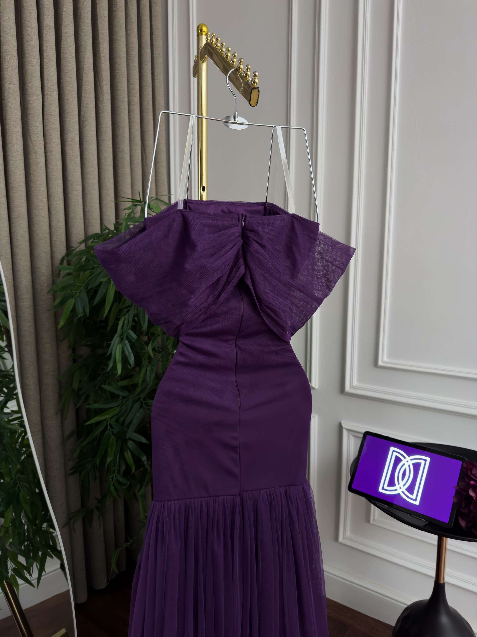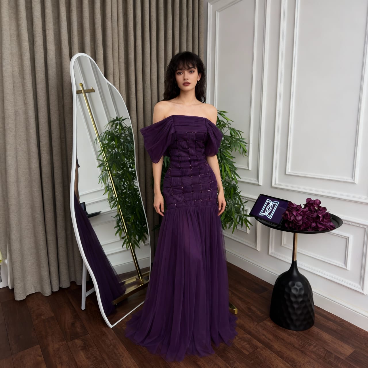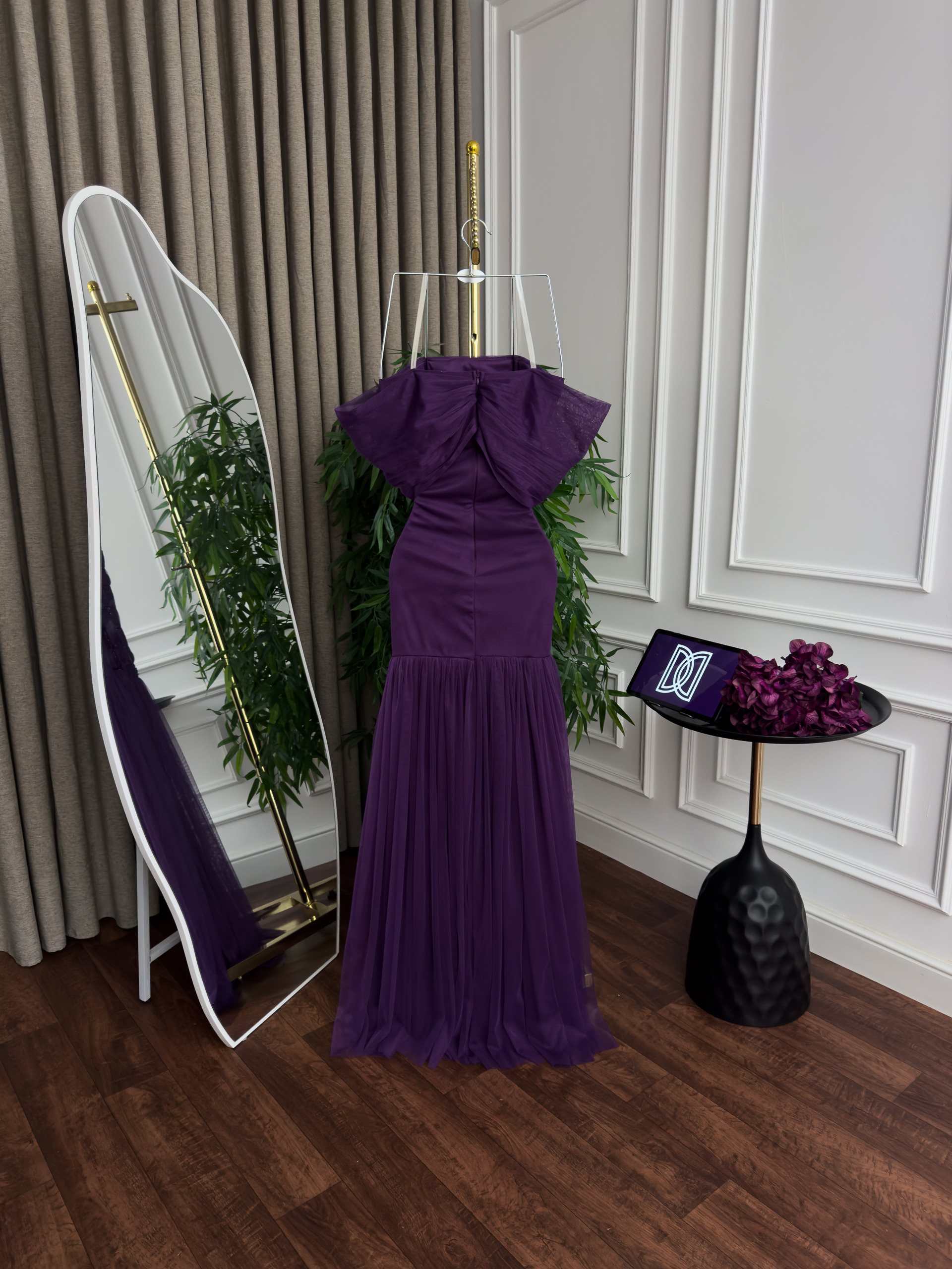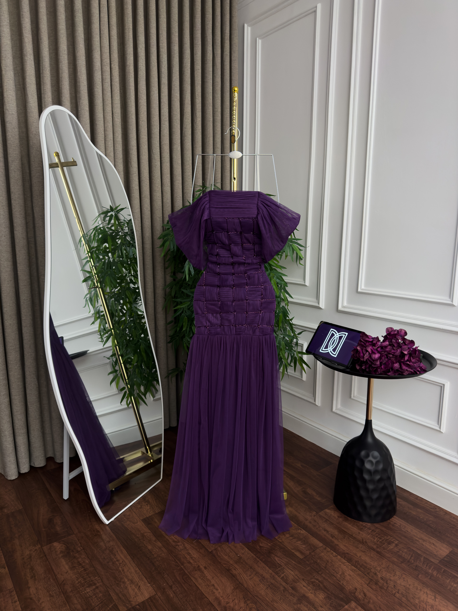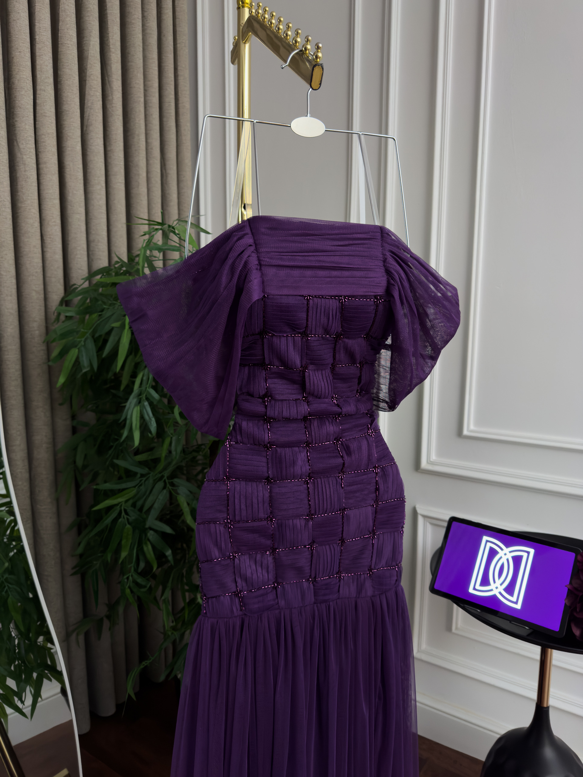 الفخامة لا تحتاج إلى مبالغة، بل إلى تفاصيل تنطق بالأناقة — وهذا ما يقدمه لكِ فستان السهرة البنفسجي من روزيتا.