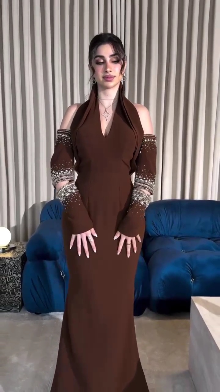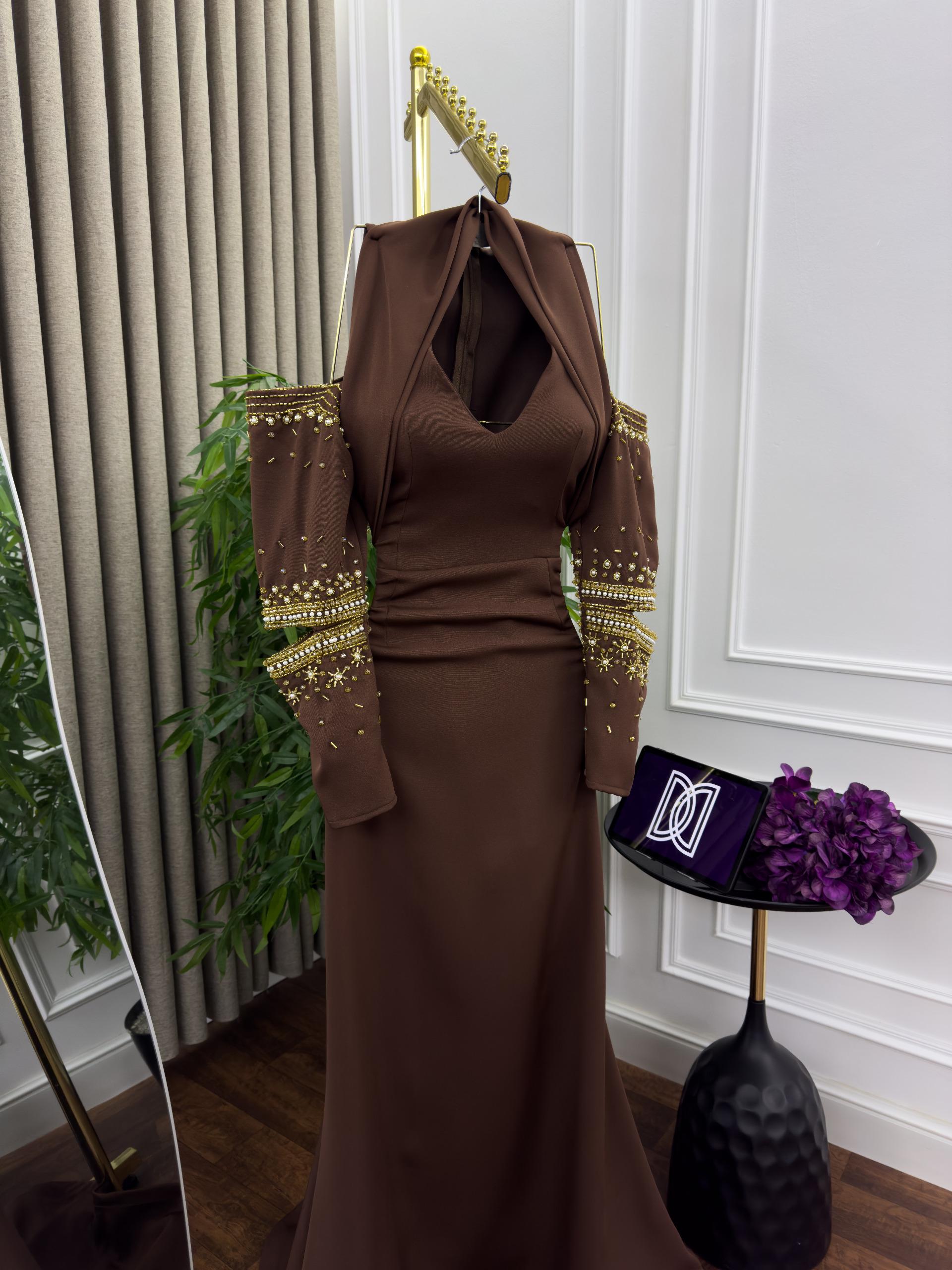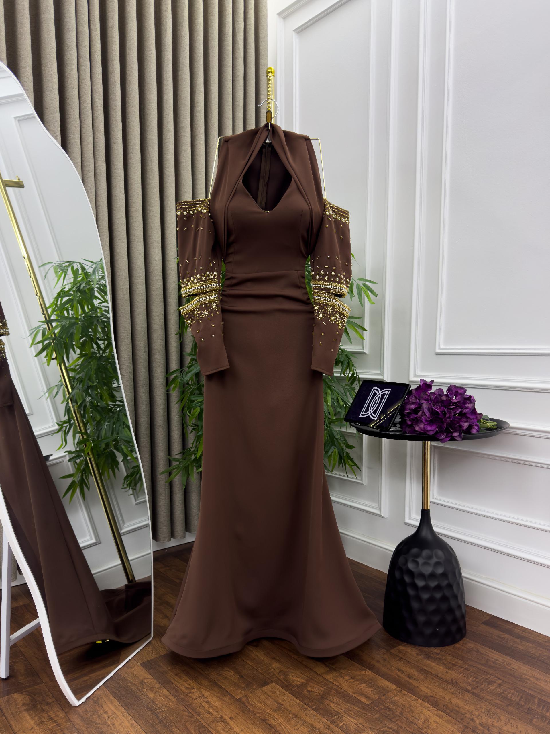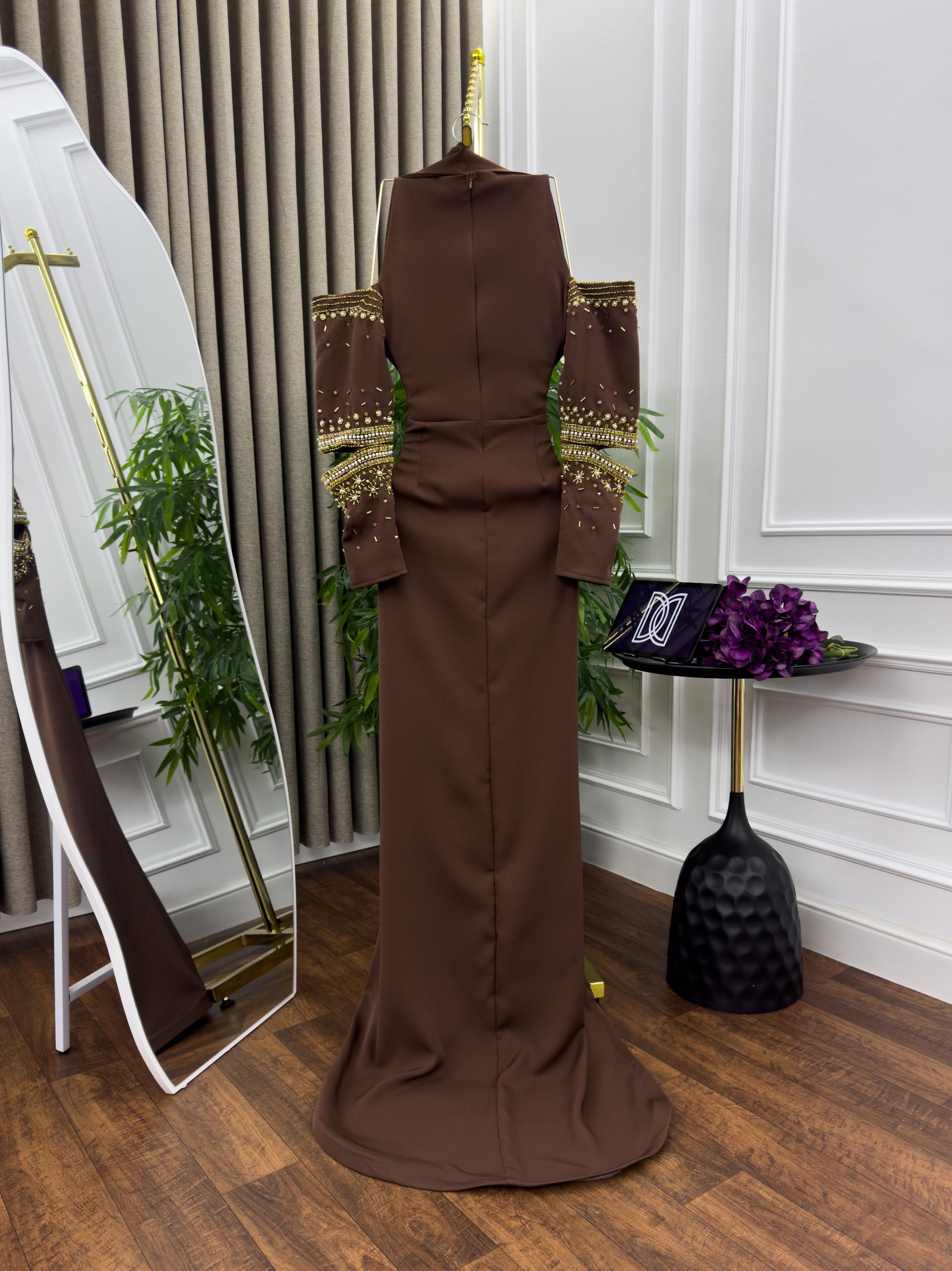 فستان سهرة بني بأكمام مكشوفة وتطريز ذهبي فاخر