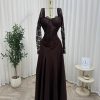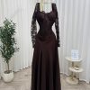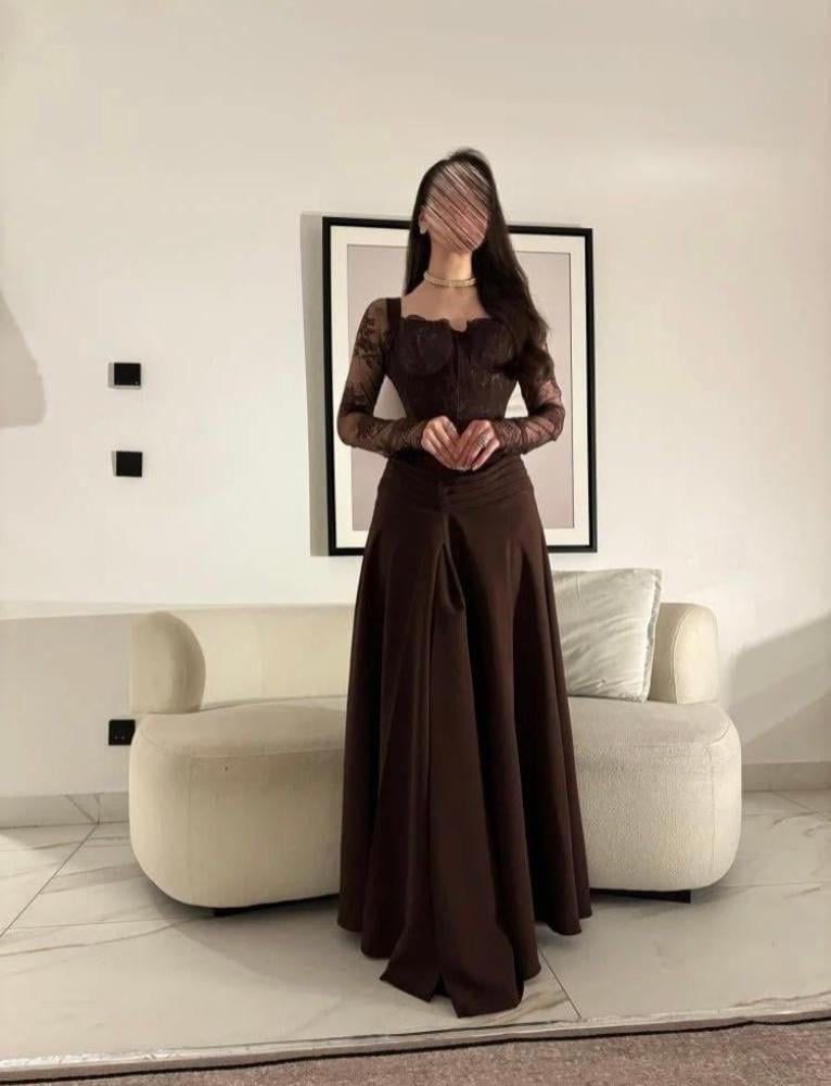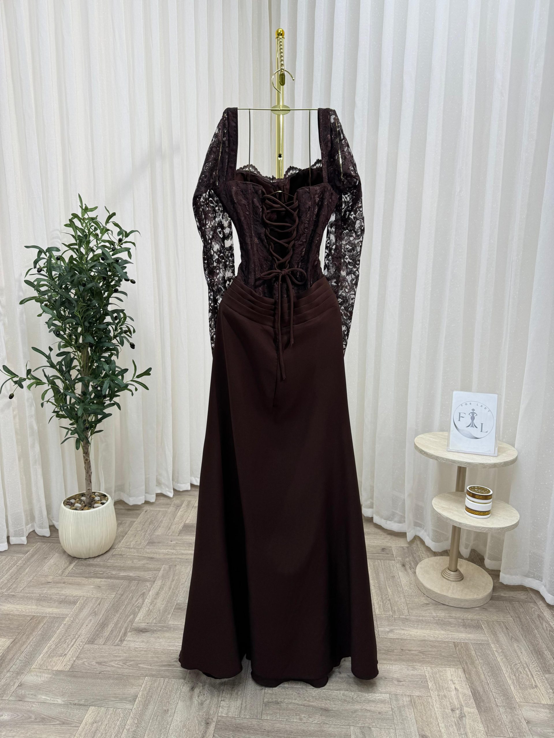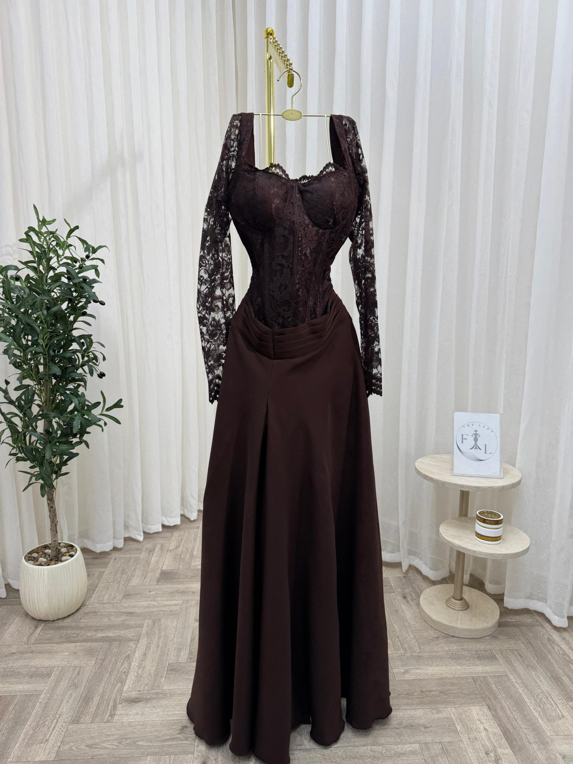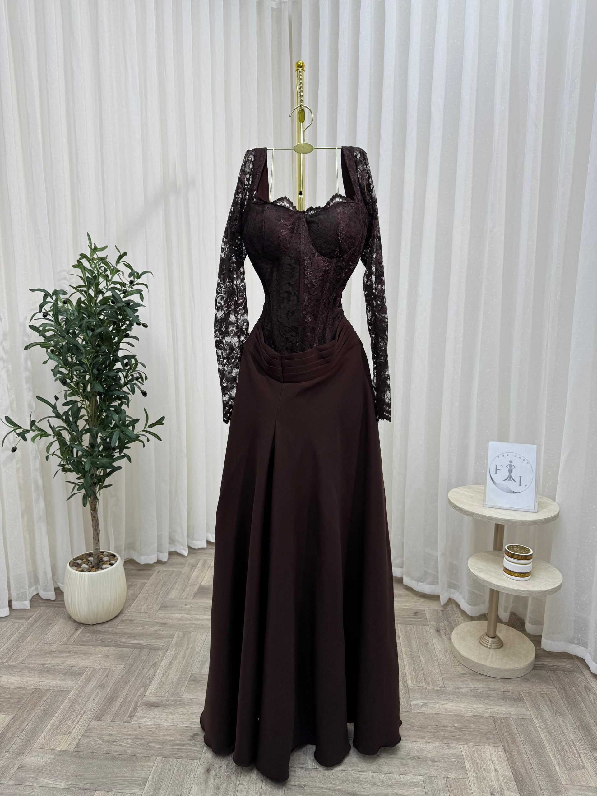 فستان سهرة بني داكن بتفاصيل دانتيل وأكمام طويلة