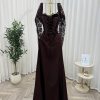 فستان سهرة بني داكن بتفاصيل دانتيل… فخامة دافئة لإطلالة راقية | متجر روزيتا السعودي