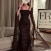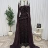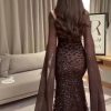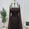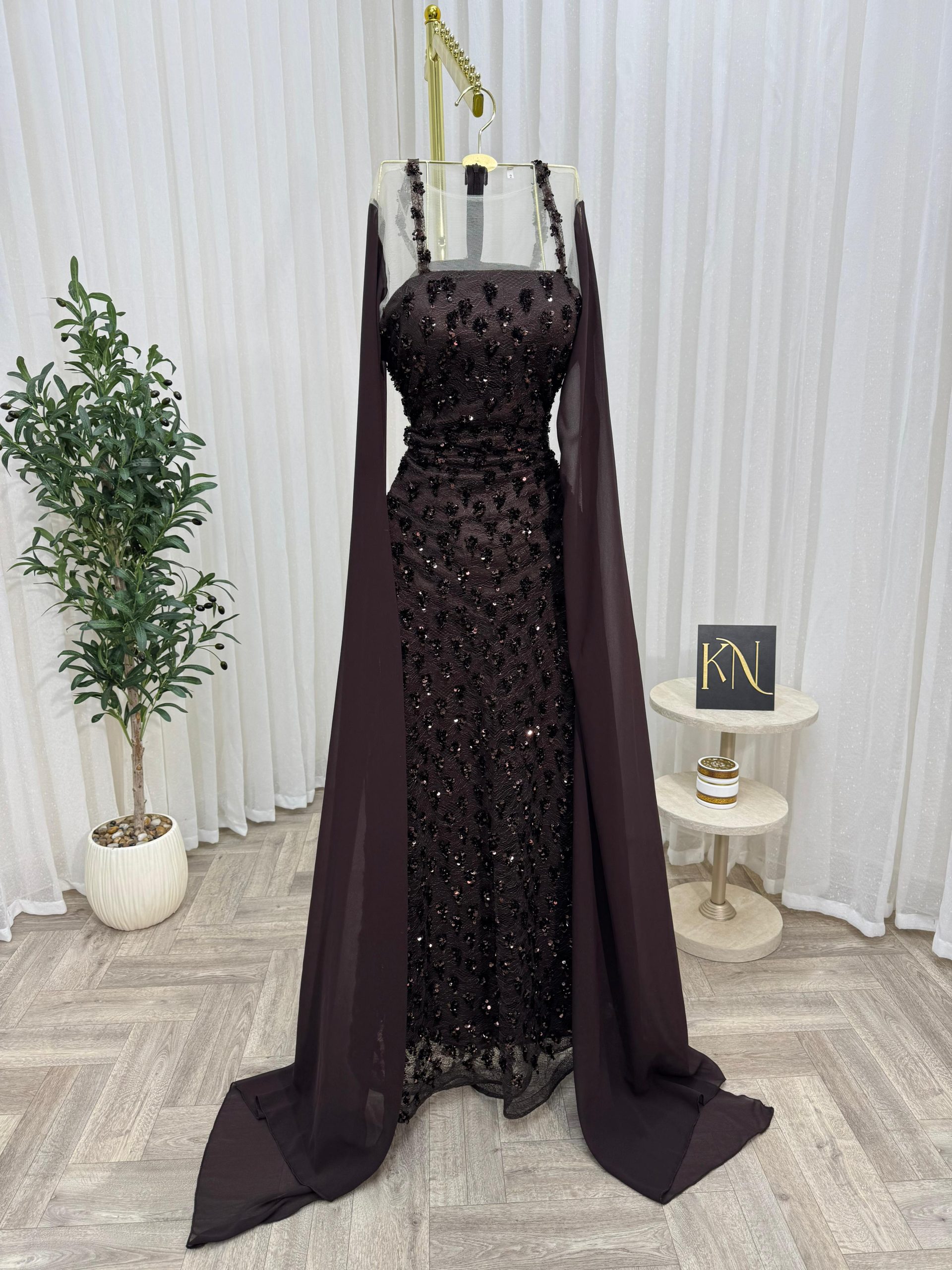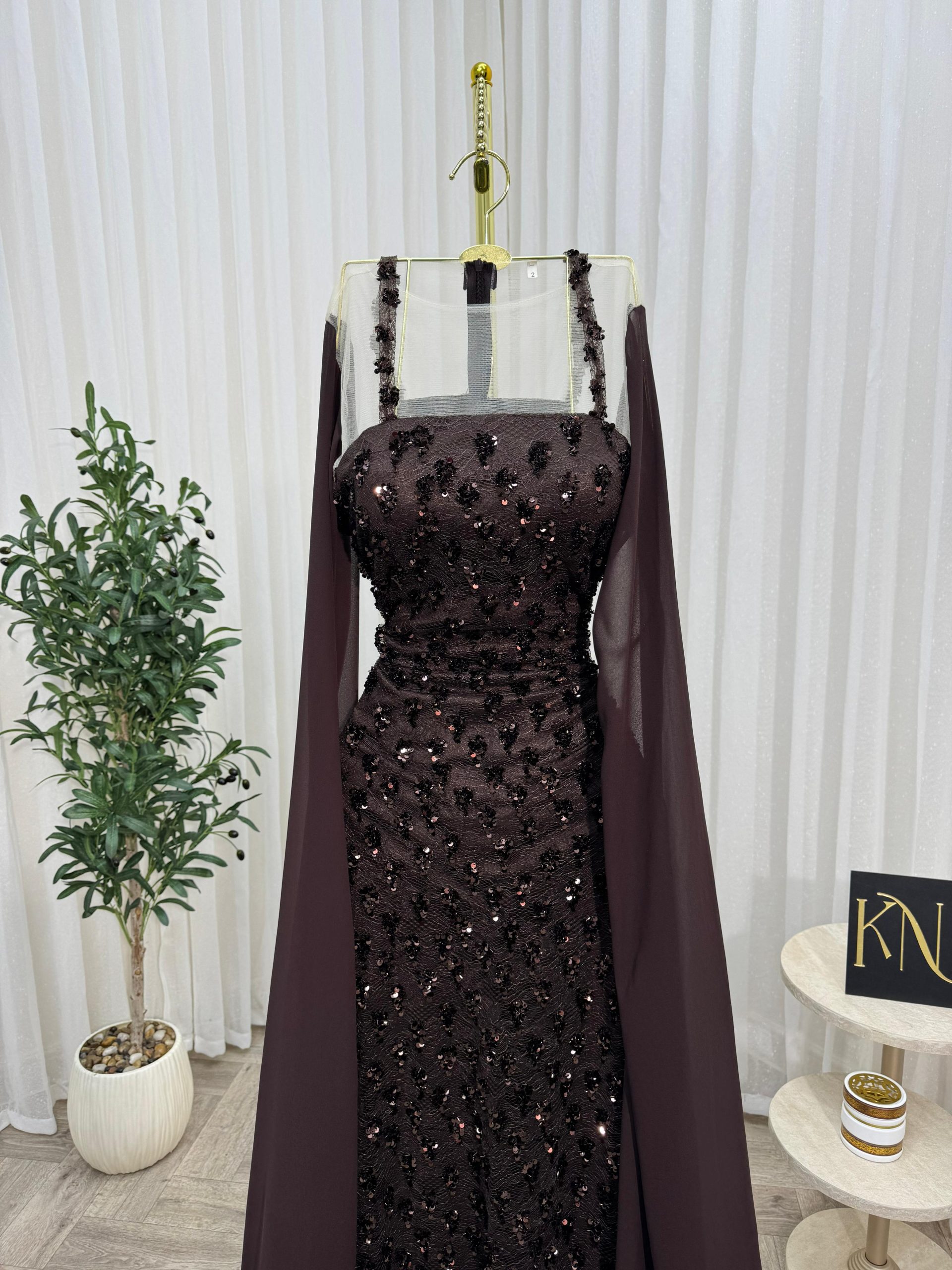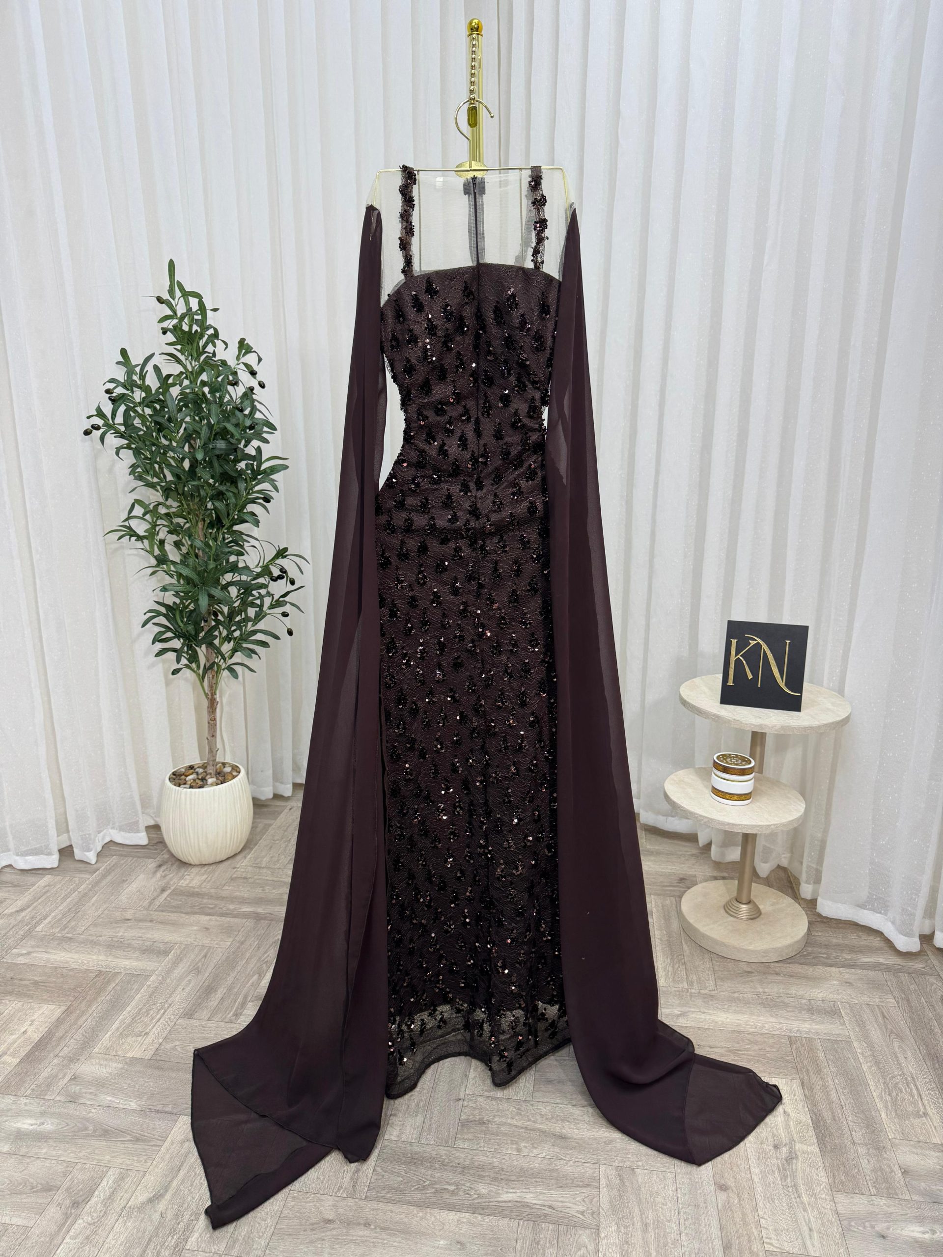 فستان سهرة بني داكن مطرز بحمالات شفافة وأكمام منسدلة