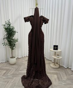 فستان سهرة بني شوكولاتة مطرز… فخامة دافئة وأناقة راقية | متجر روزيتا السعودي