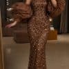 فستان سهرة بني غامق فاخر بتطريز لامع وذيل أورجنزا أنيق