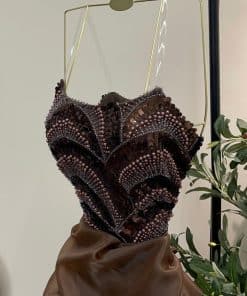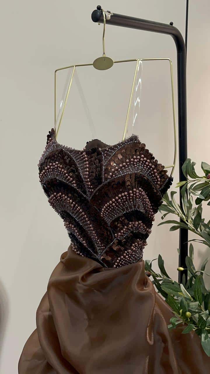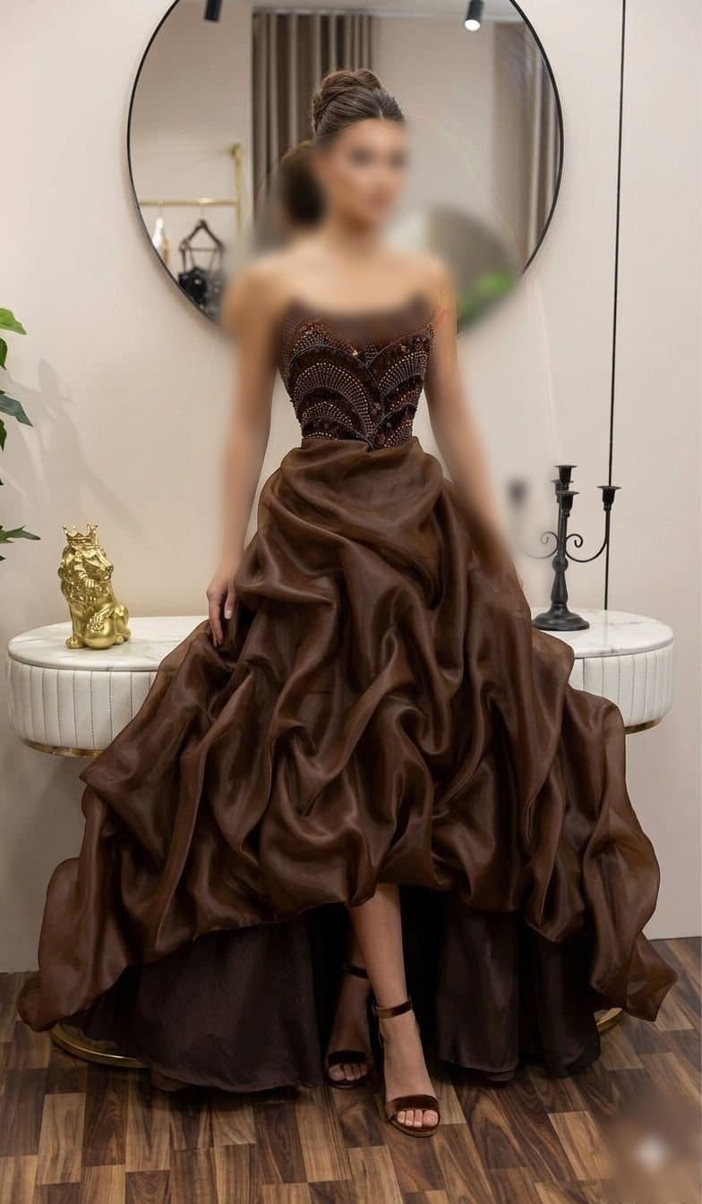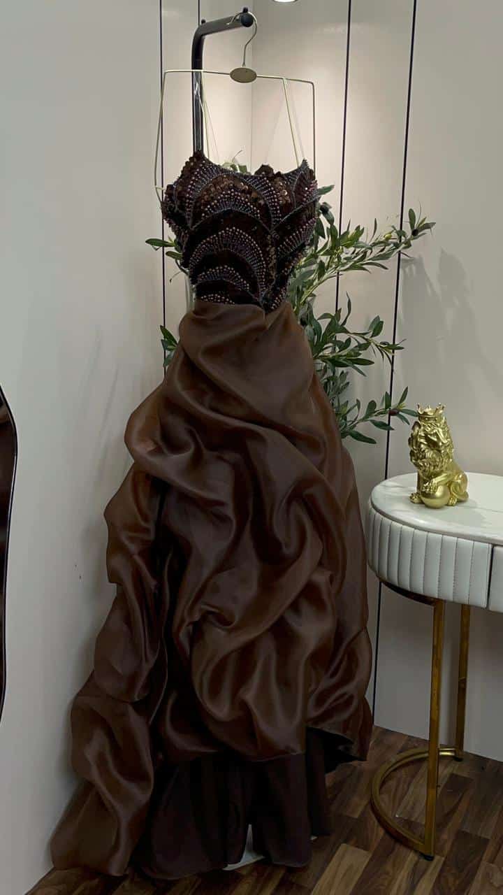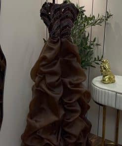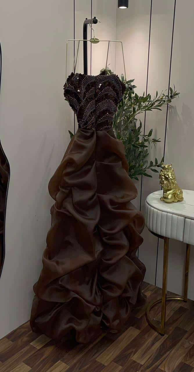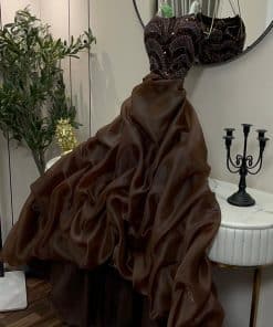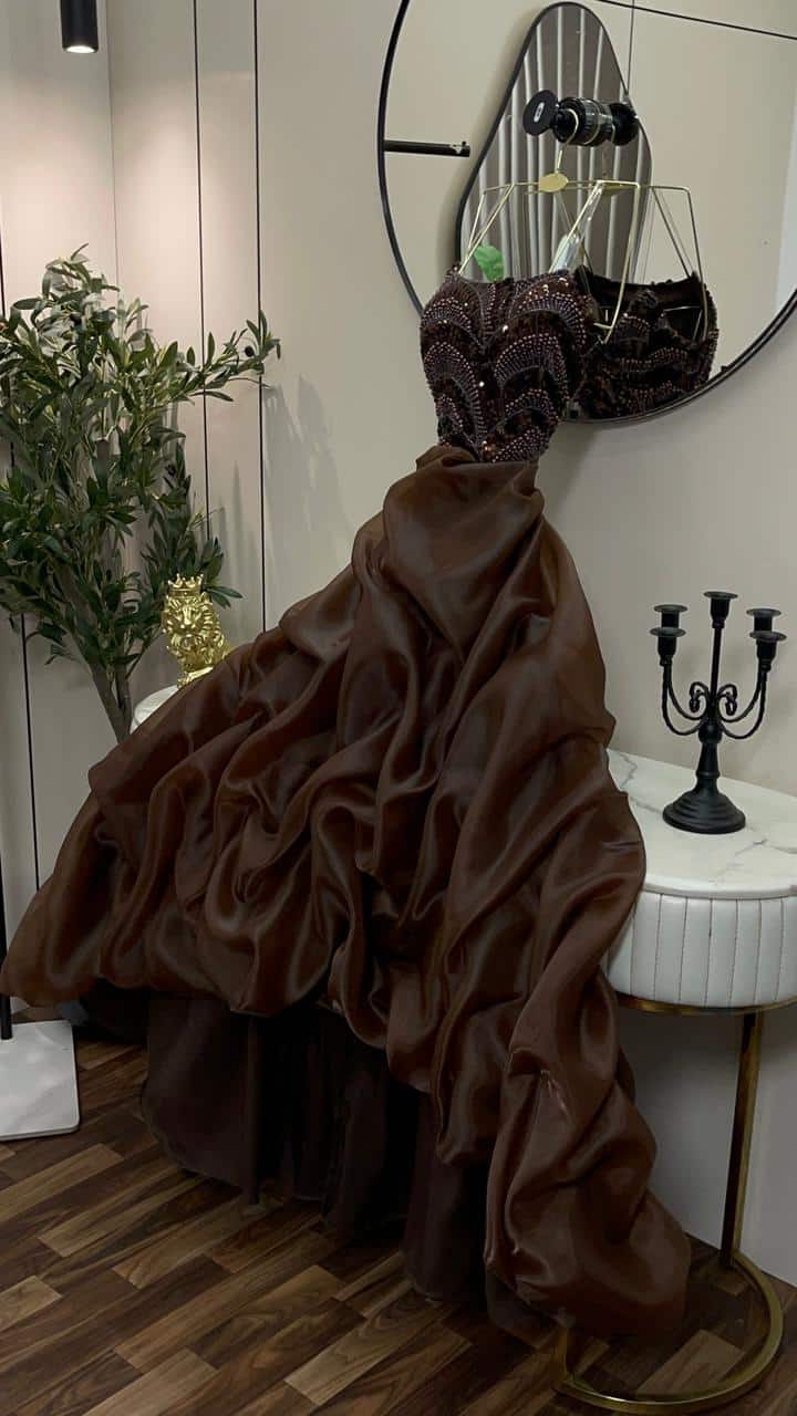 فستان سهرة باللون البني الغامق يمنحك إطلالة فخمة وساحرة في جميع المناسبات داخل السعودية. يتميز بتطريزات لامعة على الصدر تضيف لمسة أنثوية راقية، مع ذيل أورجنزا فاخر يخلق حركة انسيابية وأناقة ملكية.