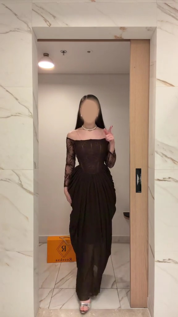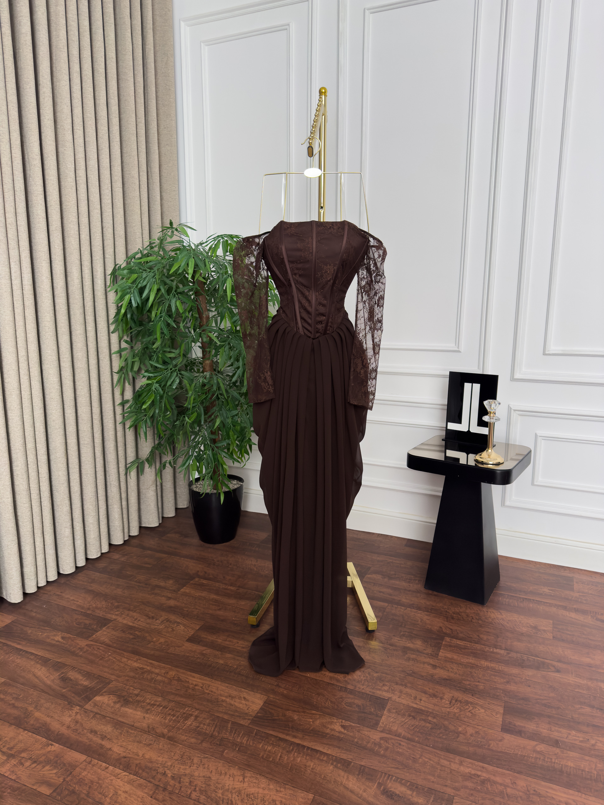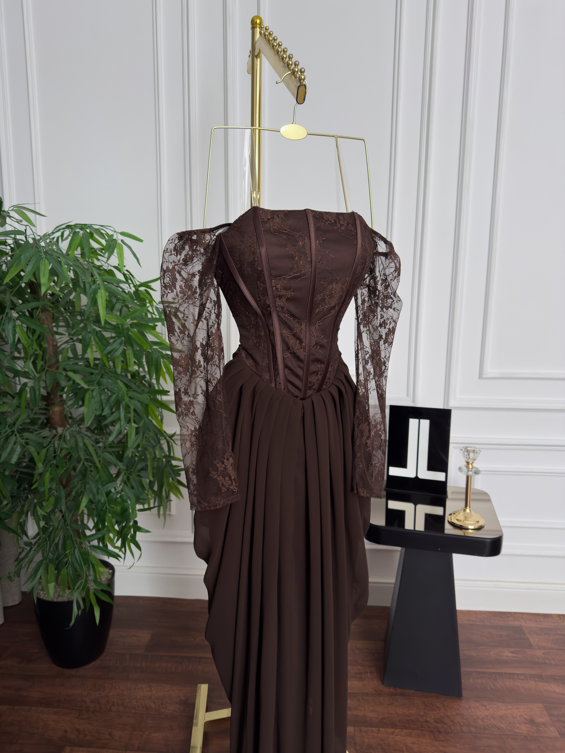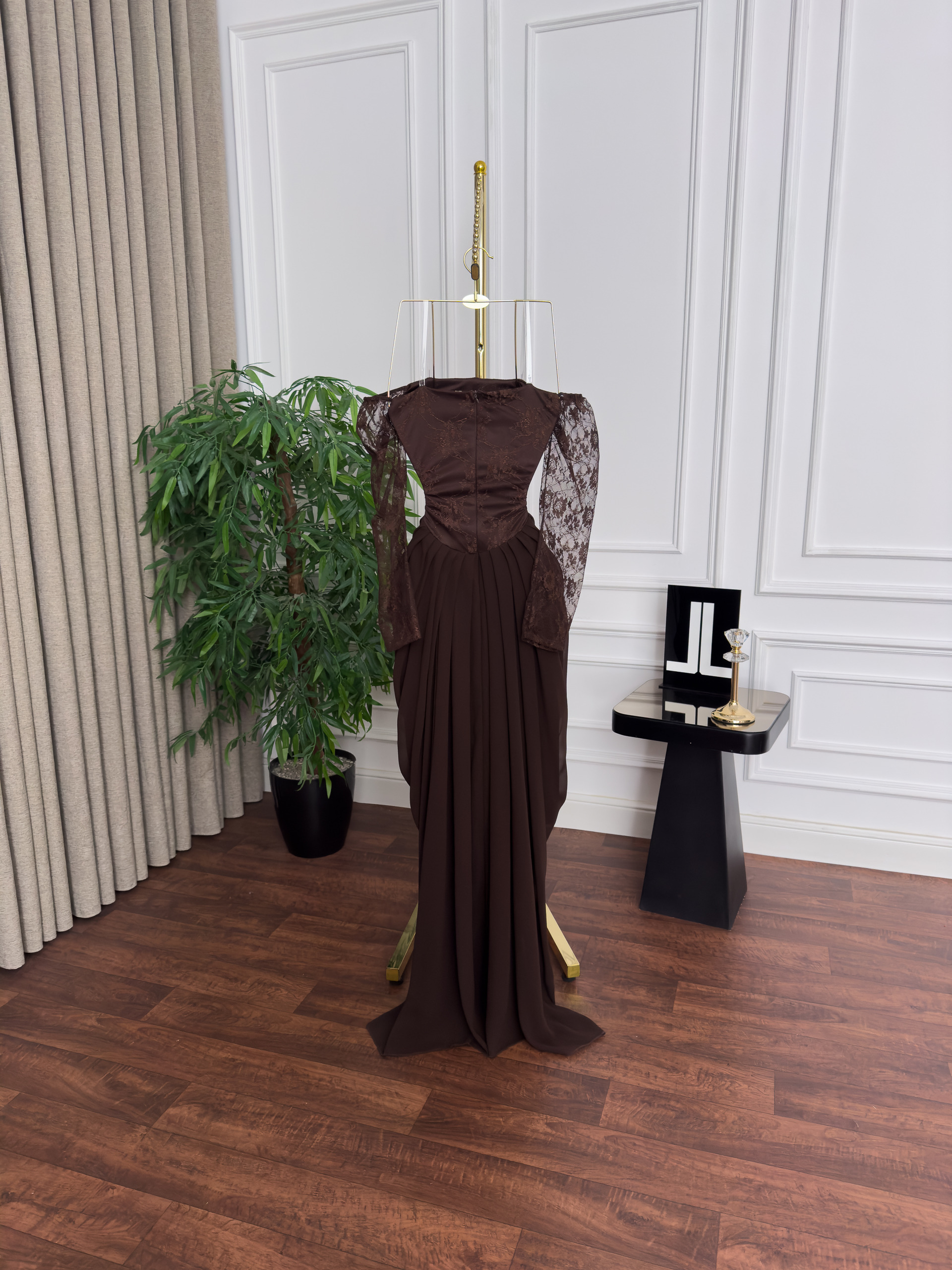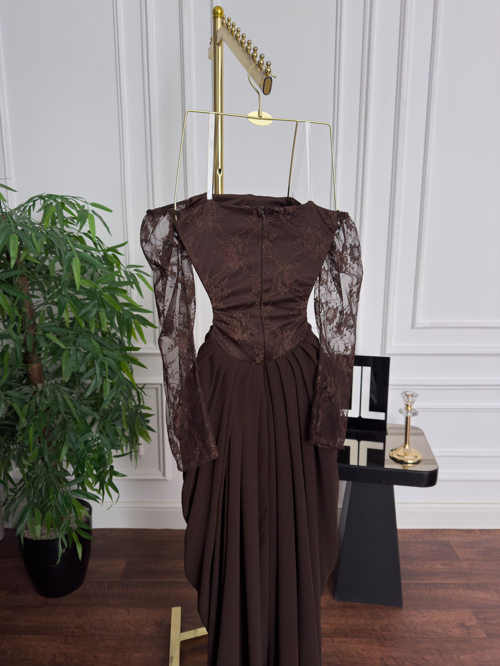 يتميز الفستان بتصميمه الذي يجمع بين الكلاسيكية والعصرية في آن واحد. الجزء العلوي من الفستان مزين بتفاصيل الدانتيل الدقيقة التي تضفي لمسة من الأنوثة والنعومة، بينما يتدفق القماش البني الناعم في الأسفل بشكل انسيابي، مما يبرز قوامك بطريقة فاخرة. الأكمام الطويلة من الدانتيل تساهم في إضفاء مظهر راقٍ ومتوازن، مما يجعل هذا الفستان مثالياً للمناسبات المسائية الرسمية.