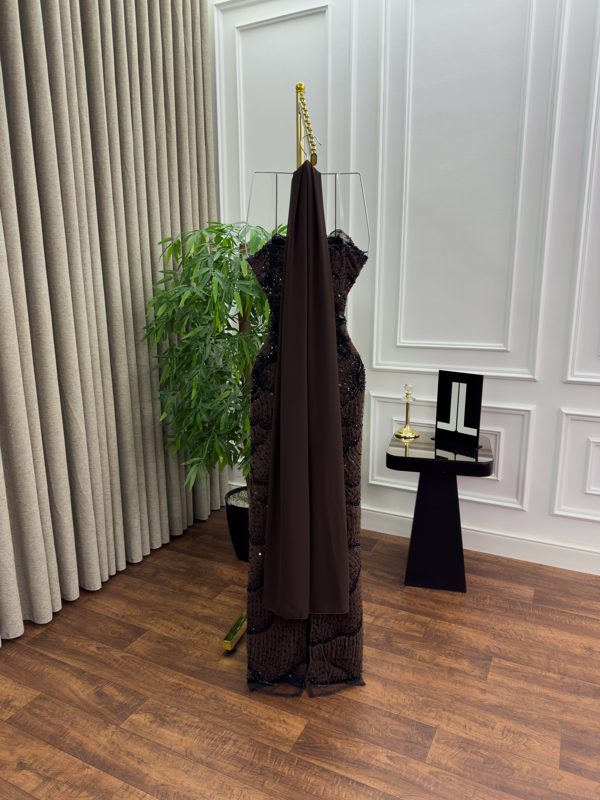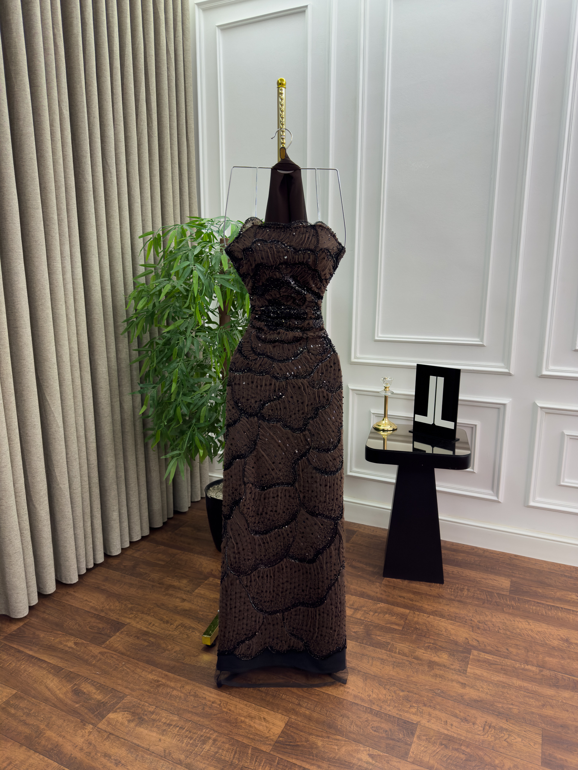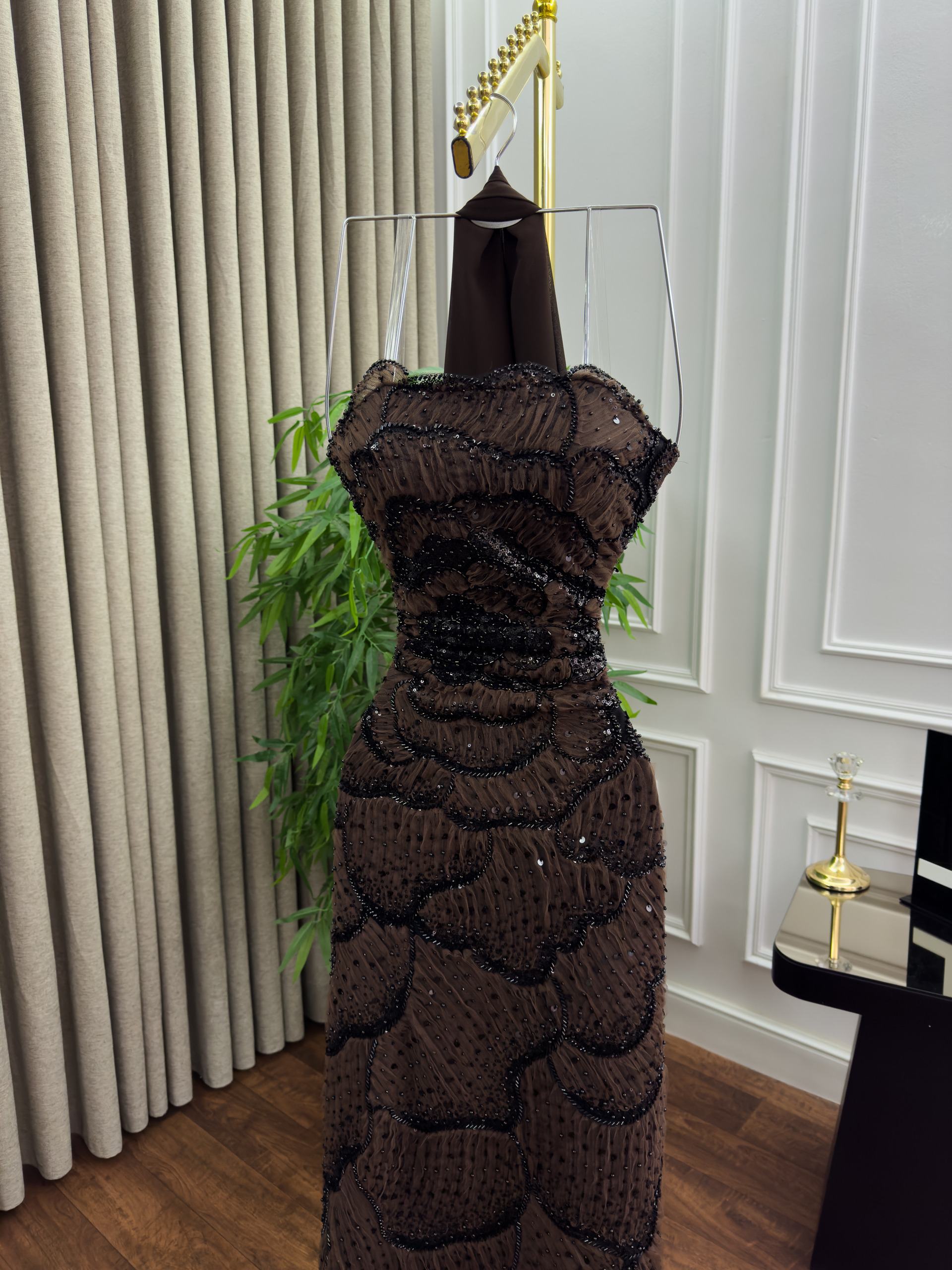 فستان سهرةبني مرصّع بتصميم راقٍ – أناقة مترفة من متجر روزيتا