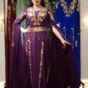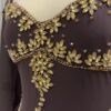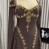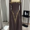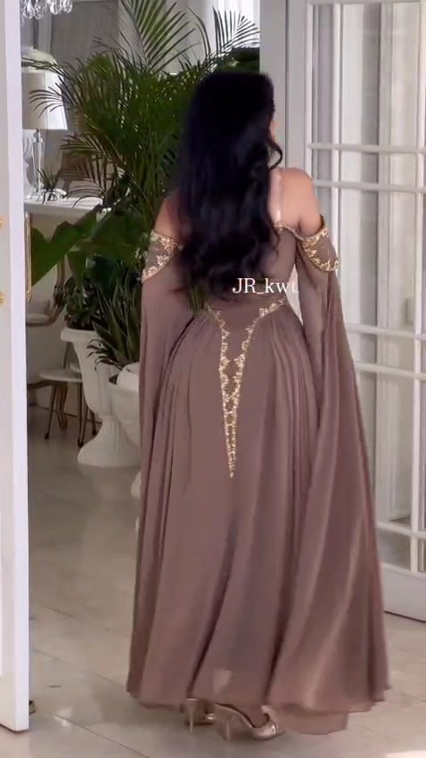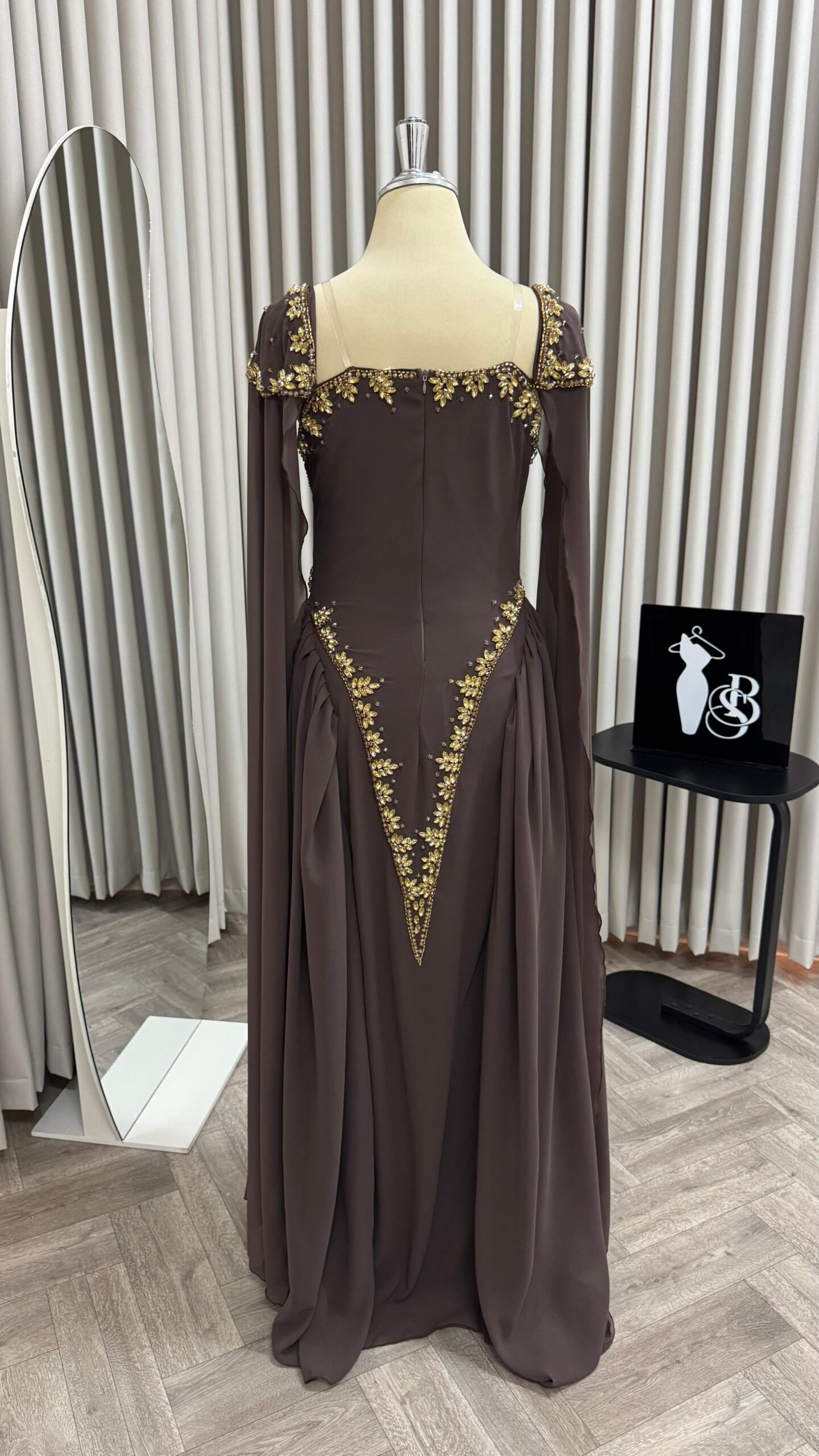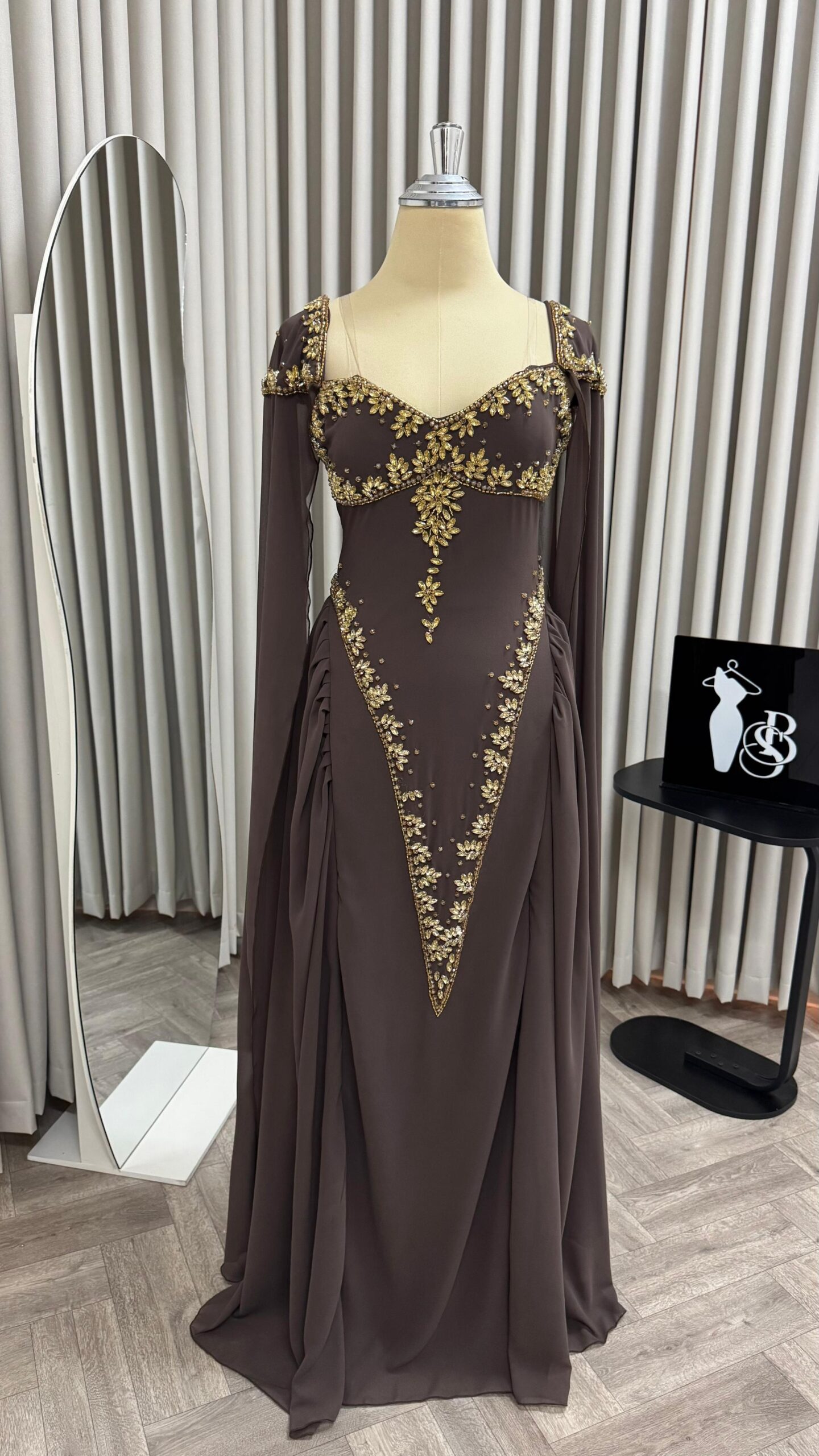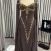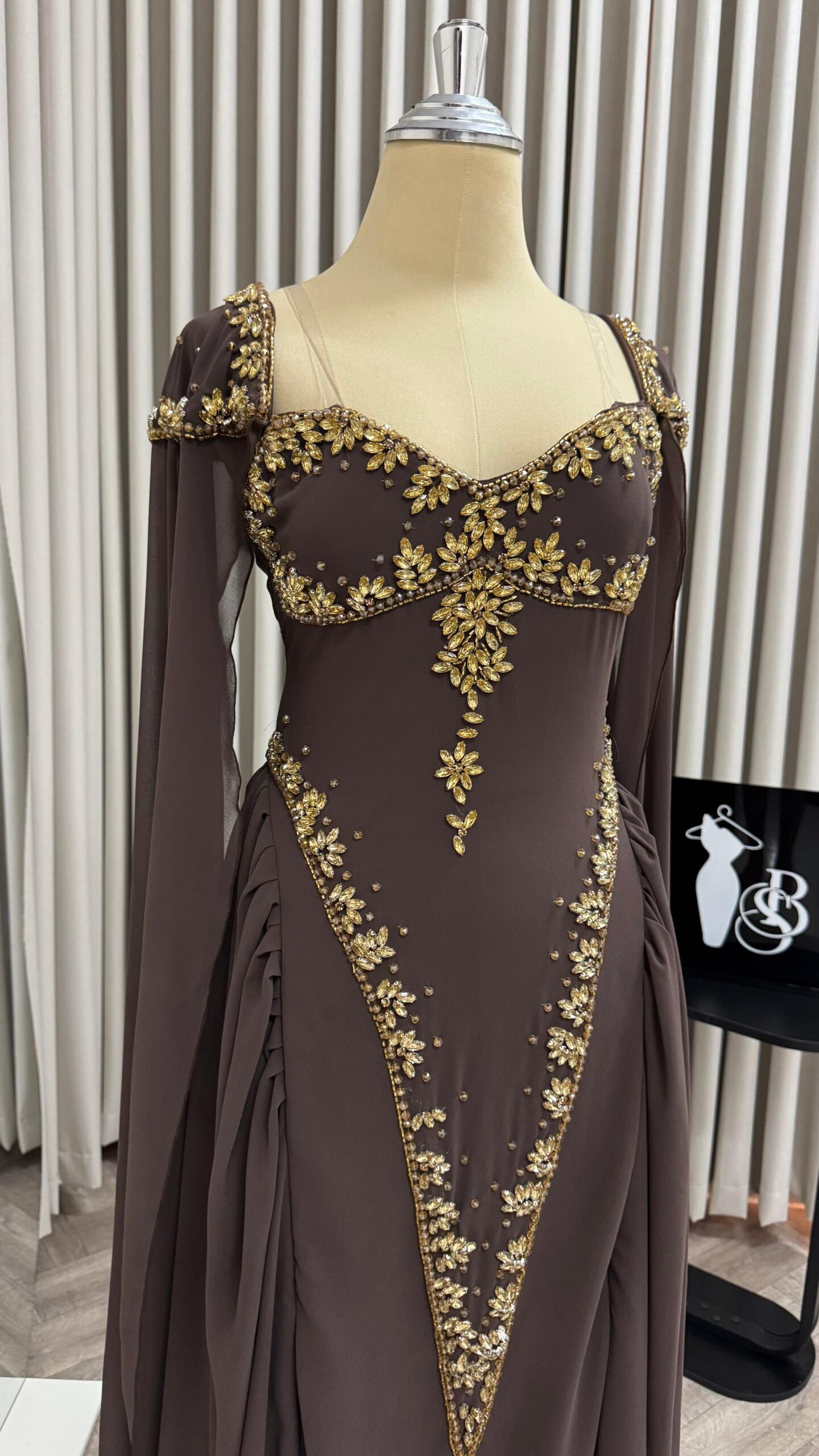 فستان سهرة بني مطرز بالذهبي – أناقة ملكية لمناسباتك الخاصة