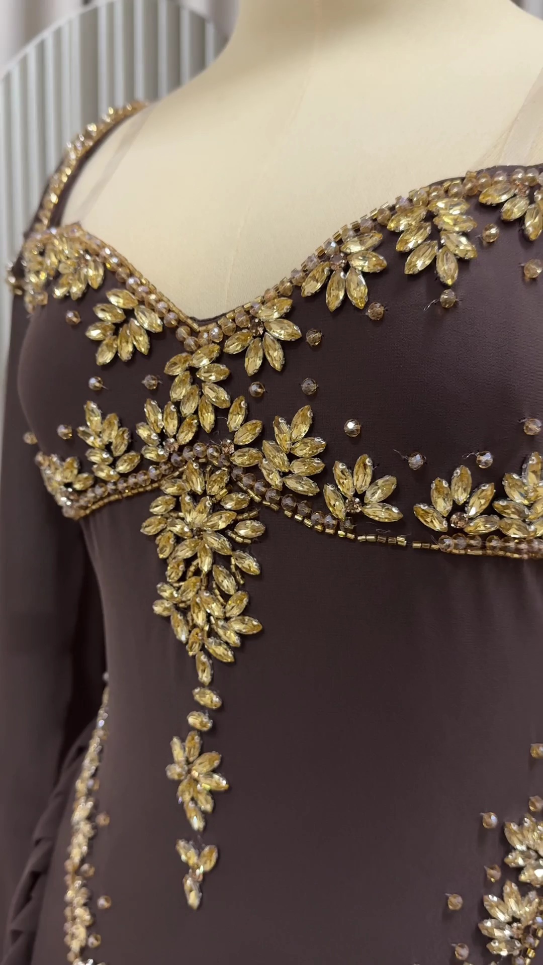تميزي بإطلالة استثنائية مع هذا الفستان الفاخر باللون البني الداكن والمزين بتطريزات ذهبية لامعة تضفي لمسة ملكية راقية. الفستان مصمم بقصة ضيقة من الأعلى لإبراز جمال القوام، مع تطريزات أنيقة حول الصدر والخصر تمتد بشكل هندسي مميز يمنح شكلاً أكثر نحافة وأناقة.