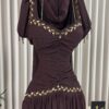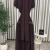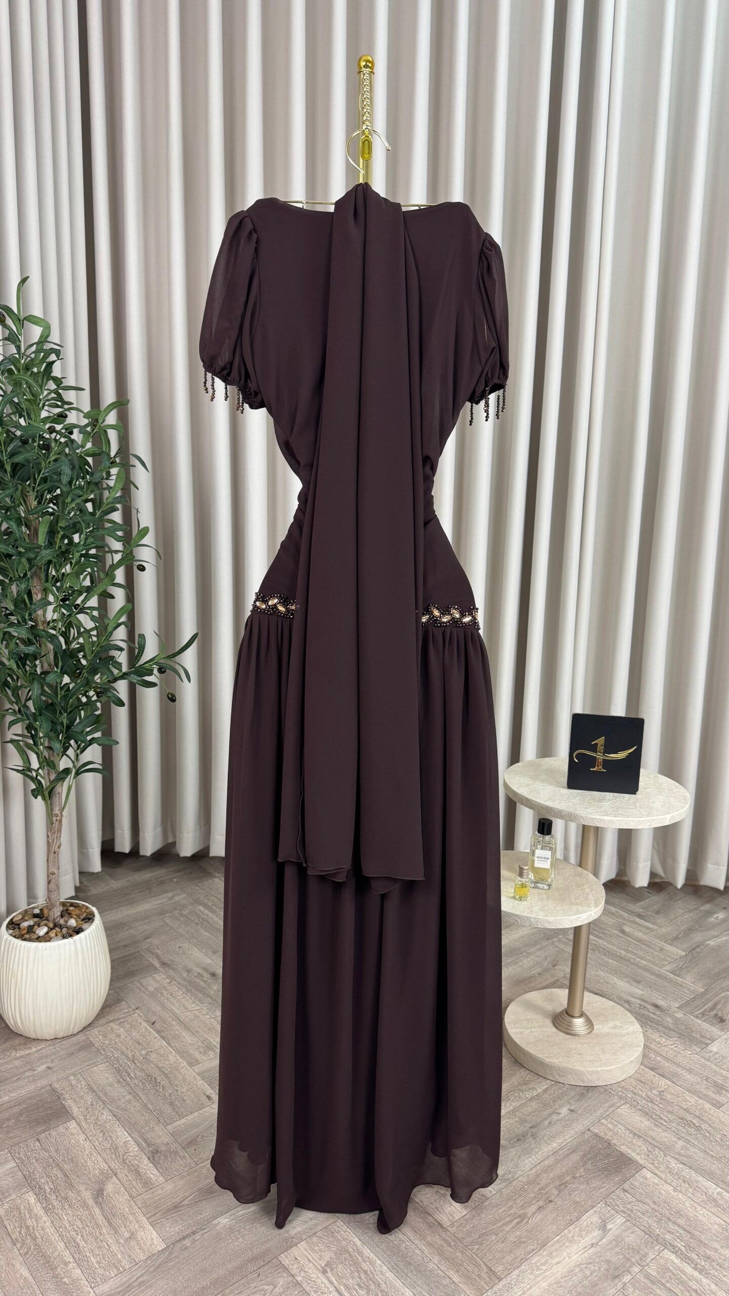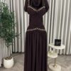 يأتي الفستان بلون بني داكن غني يمنح إطلالة ملكية مفعمة بالوقار والرقي، ويُبرز جمال البشرة بطريقة ناعمة وأنيقة.