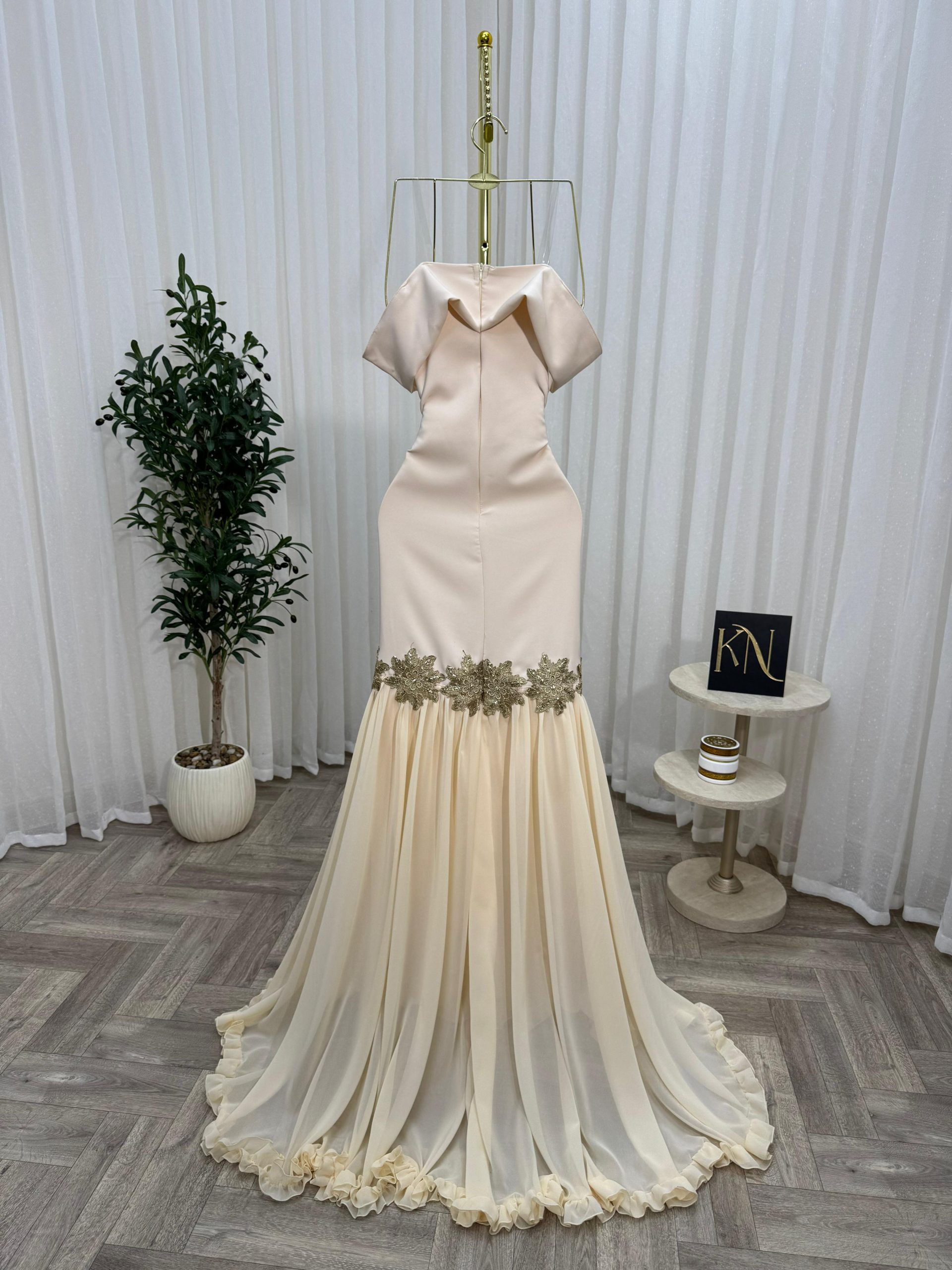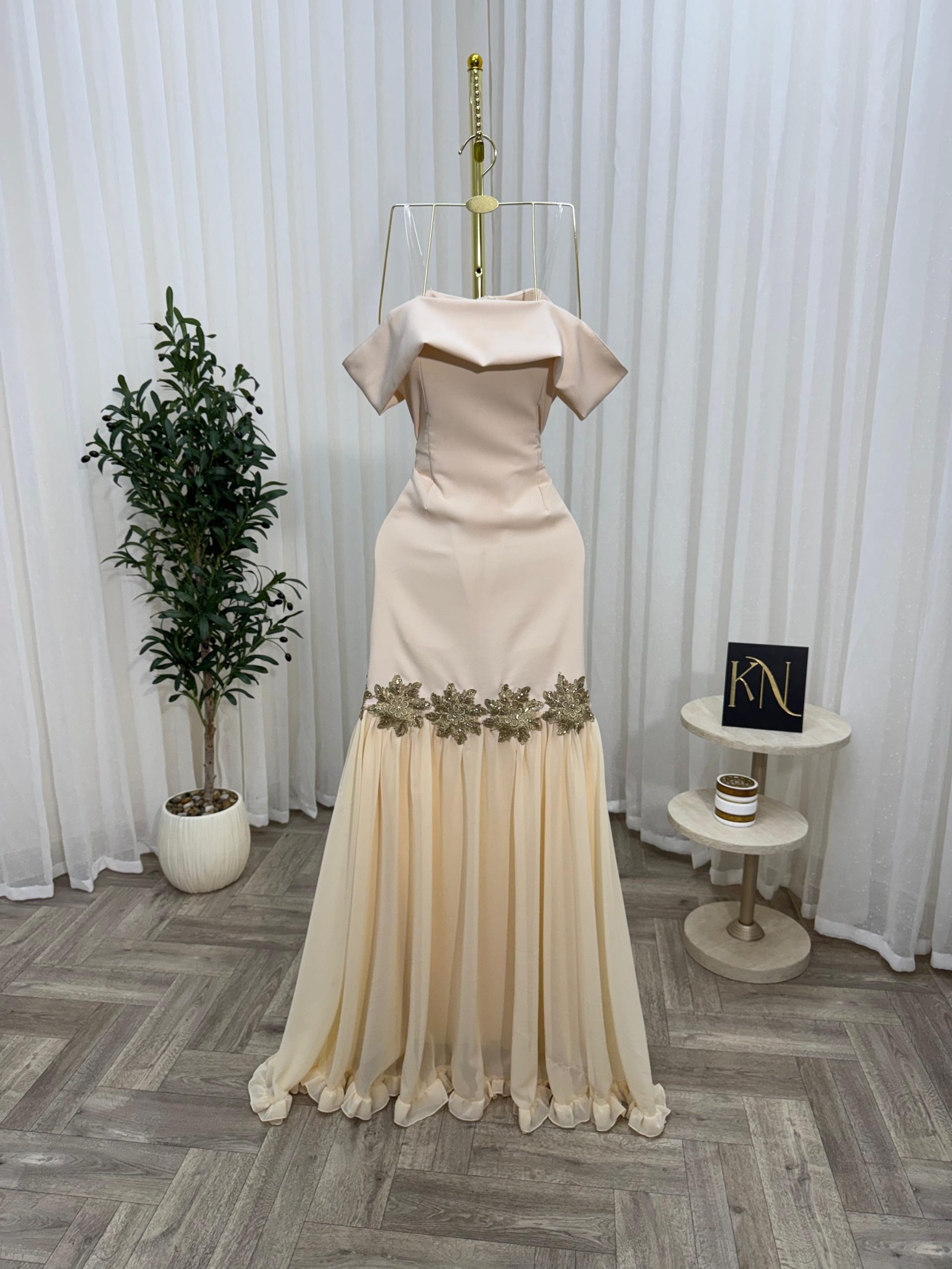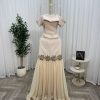 فستان سهرة بيج أنيق بقصة أوف شولدر