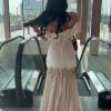 تتوسط الفستان تفاصيل دانتيل مطرزة بدقة عند منطقة الخصر، تضيف لمسة فخامة ناعمة وتمنح التصميم توازنًا جميلًا بين البساطة والتميز.