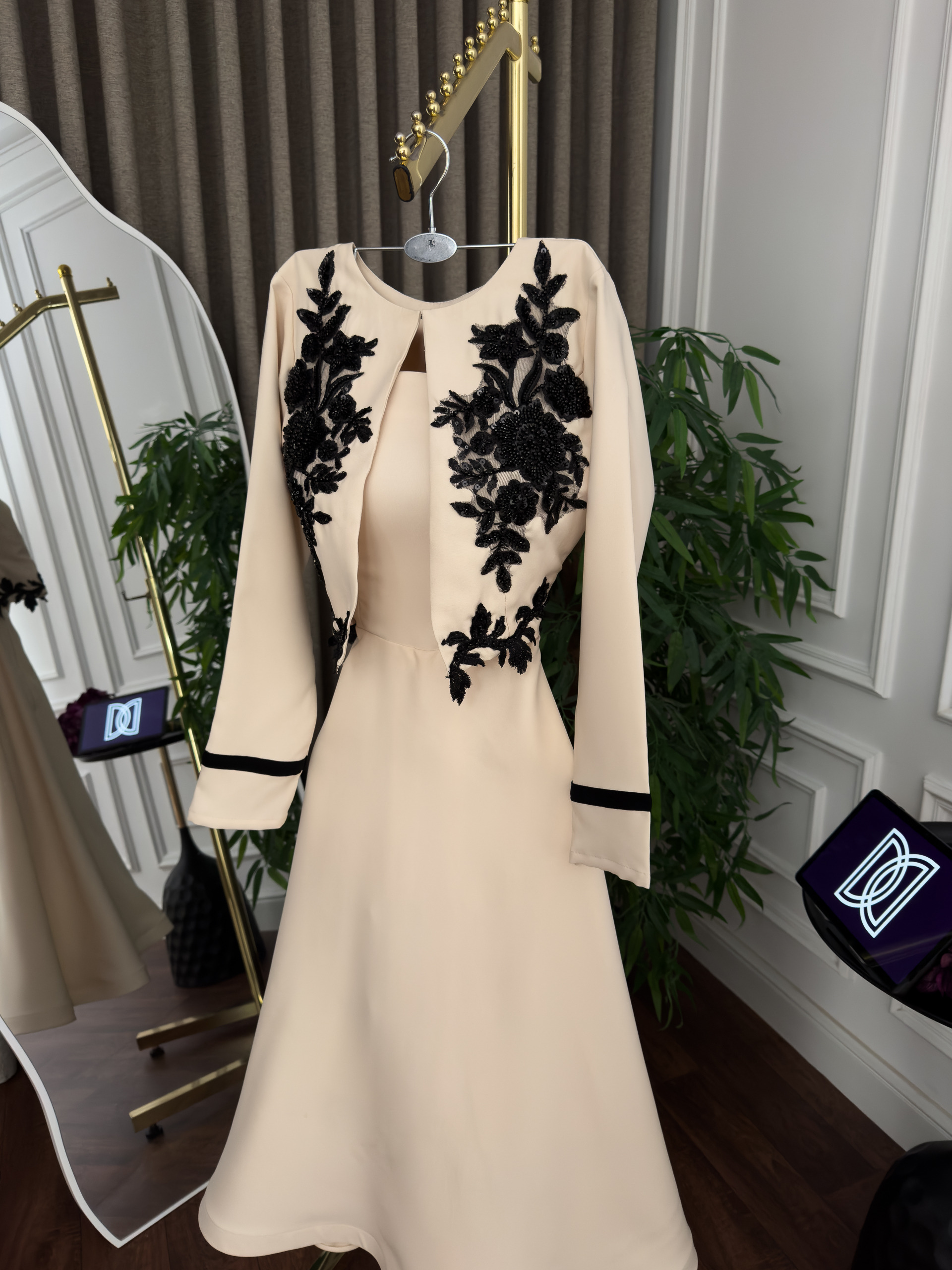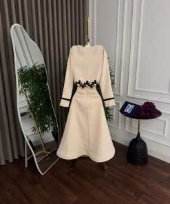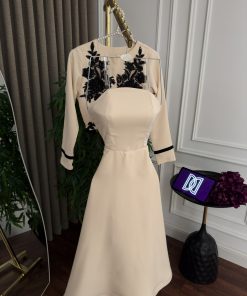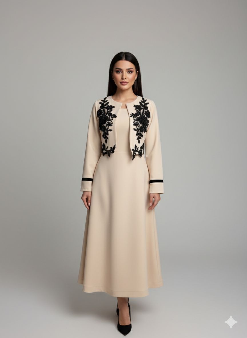 يمنحك هذا الفستان البيج الأنيق من متجر روزيتا السعودية إطلالة راقية تجمع بين البساطة والفخامة. يتميز بتصميم ناعم مع تطريز أسود فاخر على الصدر مستوحى من الزخارف الكلاسيكية، ليضفي لمسة أنثوية جذابة ومميزة.