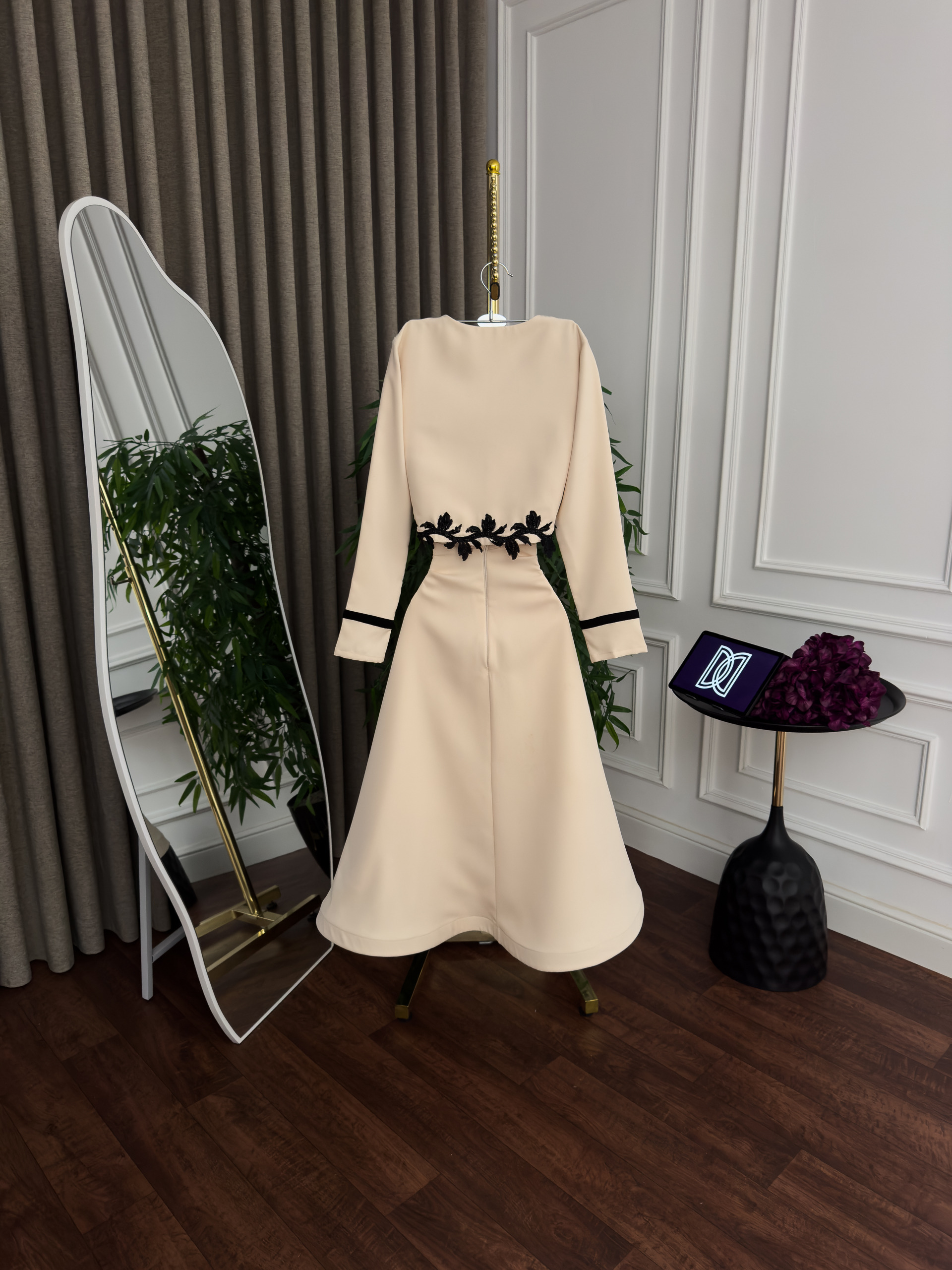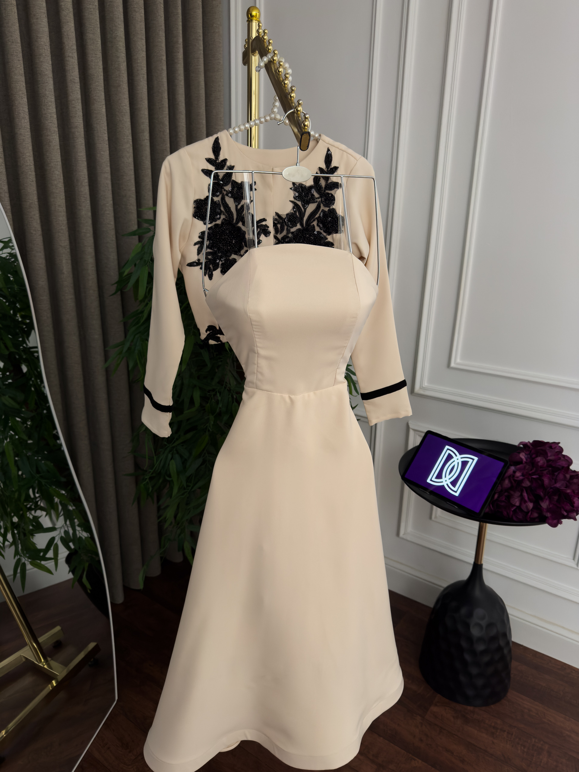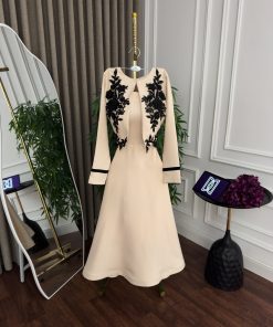 يأتي الفستان بأكمام طويلة أنيقة مع تفاصيل سوداء عند الأطراف، وقصة انسيابية تبرز جمال القوام وتمنحك راحة أثناء الارتداء. خامته عالية الجودة ومناسبة للمناسبات الرسمية والسهرات الراقية، ليكون خيارك المثالي لإطلالة أنيقة لا تُنسى.