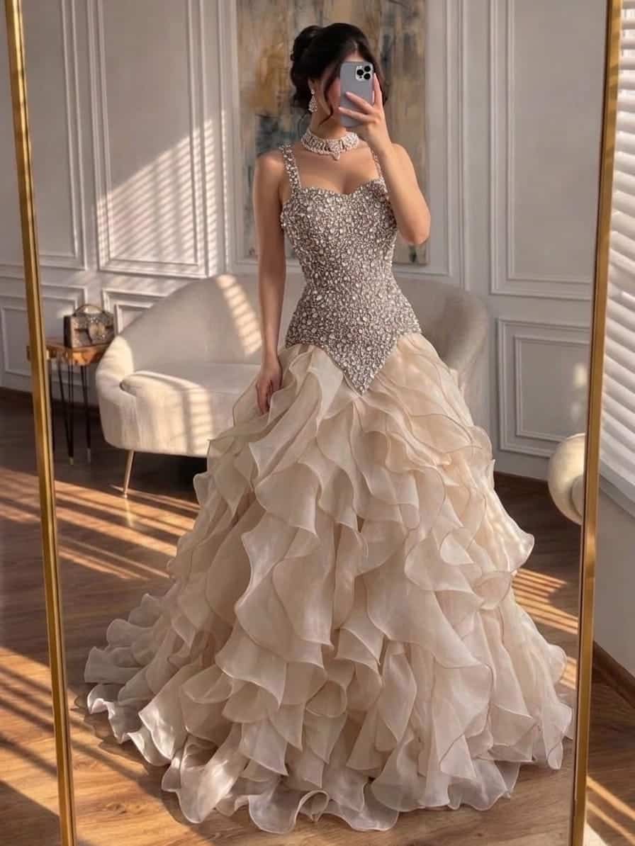 تألقي بإطلالة فاخرة تخطف الأنظار مع هذا الفستان البيج الذهبي المرصع بالكامل بتفاصيل لامعة تمنحك بريقًا راقيًا في كل مناسبة. يتميز الفستان بقصة ضيقة أنثوية تبرز جمال القوام بأسلوب ناعم وأنيق، مع رقبة عالية تضيف لمسة راقية تناسب السهرات والمناسبات الفخمة.