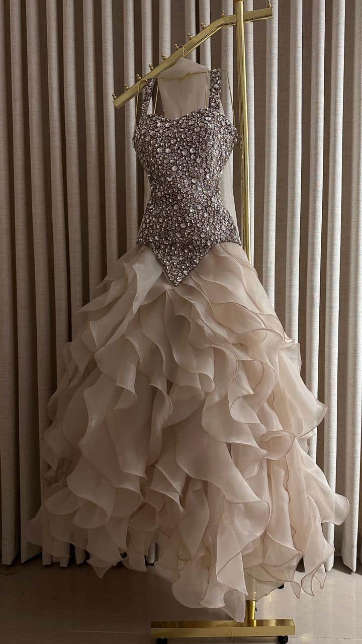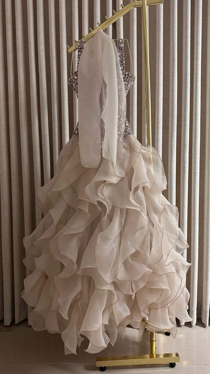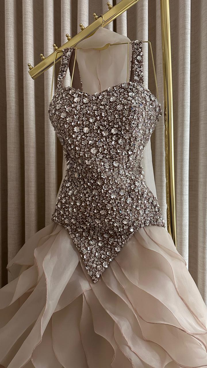 التطريزات اللامعة المنتشرة على كامل التصميم تعكس الضوء بشكل ساحر وتمنح الفستان حضورًا مميزًا، بينما تضيف الأكمام الشفافة لمسة فخامة متوازنة تجعل الإطلالة أكثر رقيًا. كما تمنح الفتحة الأمامية الأنيقة حرية حركة ولمسة عصرية جذابة، ليكون هذا التصميم مثالياً لحفلات الزفاف، الخطوبة، والسهرات الراقية في السعودية.