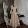 يتميز الفستان بقماش ناعم مطرز بالكامل بخيوط لامعة تضيف لمسة من الفخامة والتألق. كما أن القصّة الضيقة عند الخصر تبرز جمال القوام، في حين تمنح التنورة الواسعة انسيابية راقية تليق بسهرات الزفاف والخطوبة والمناسبات الفخمة.