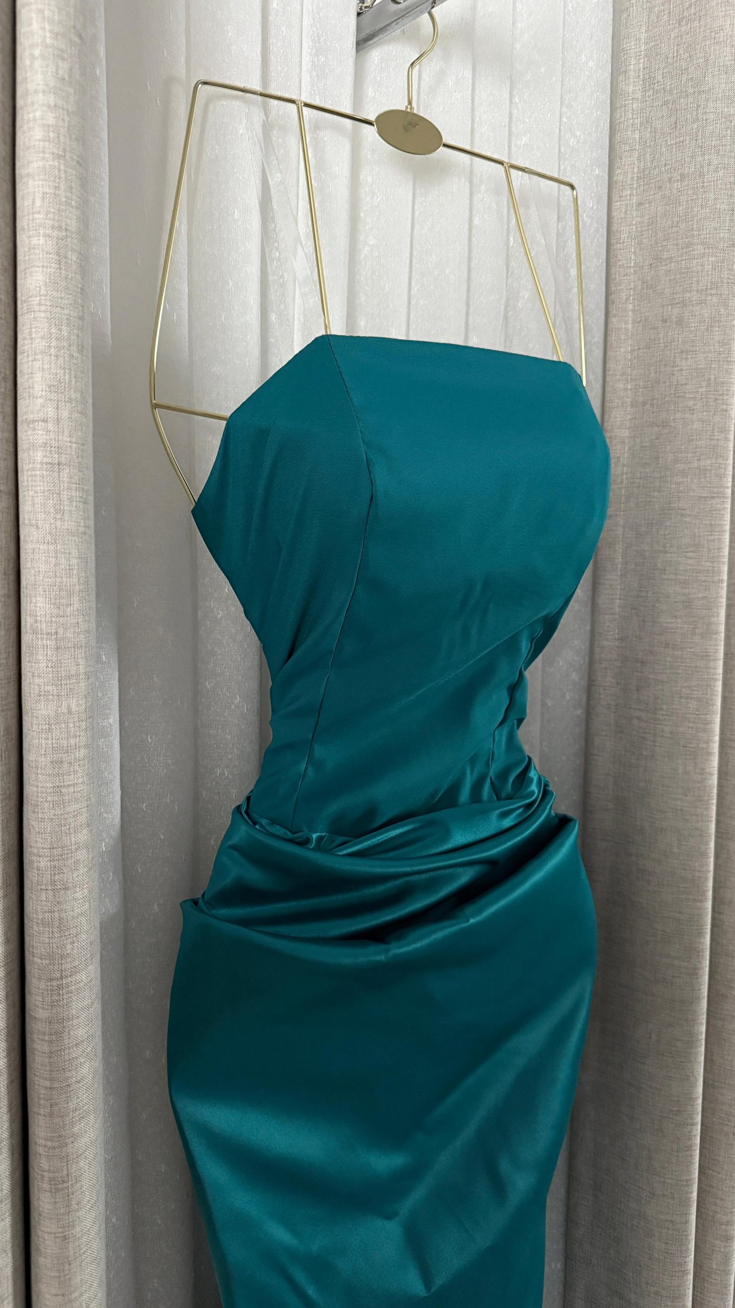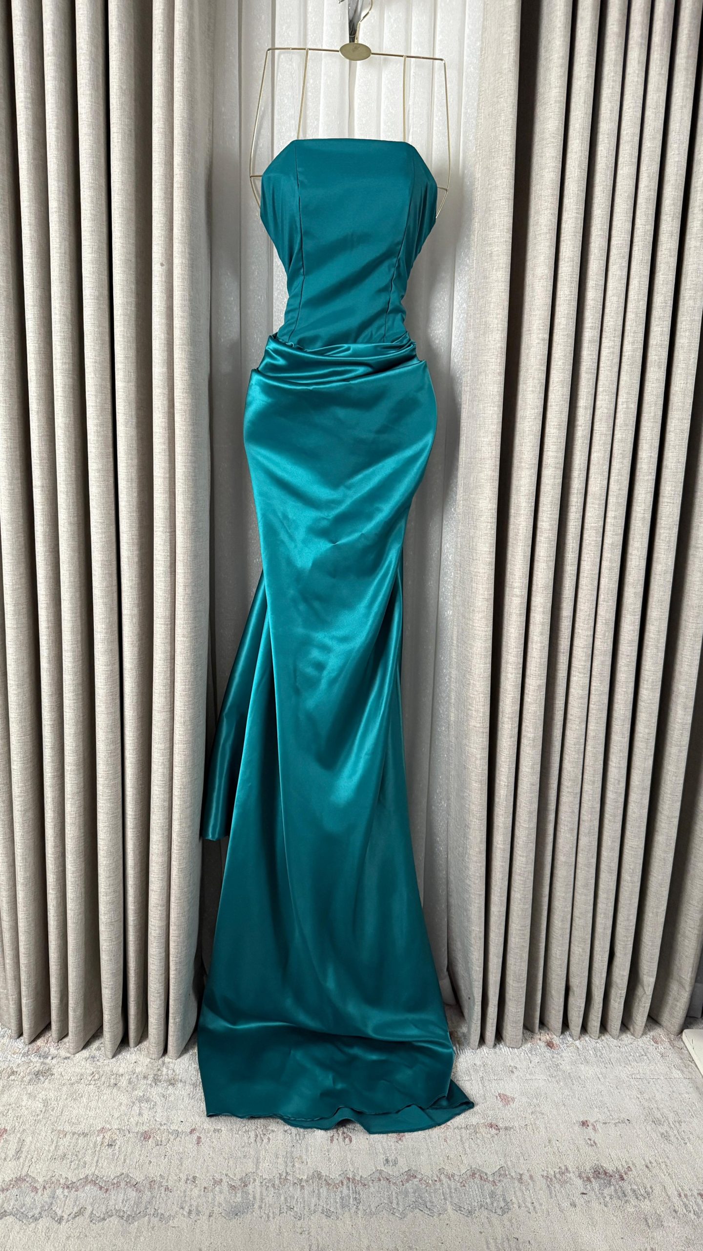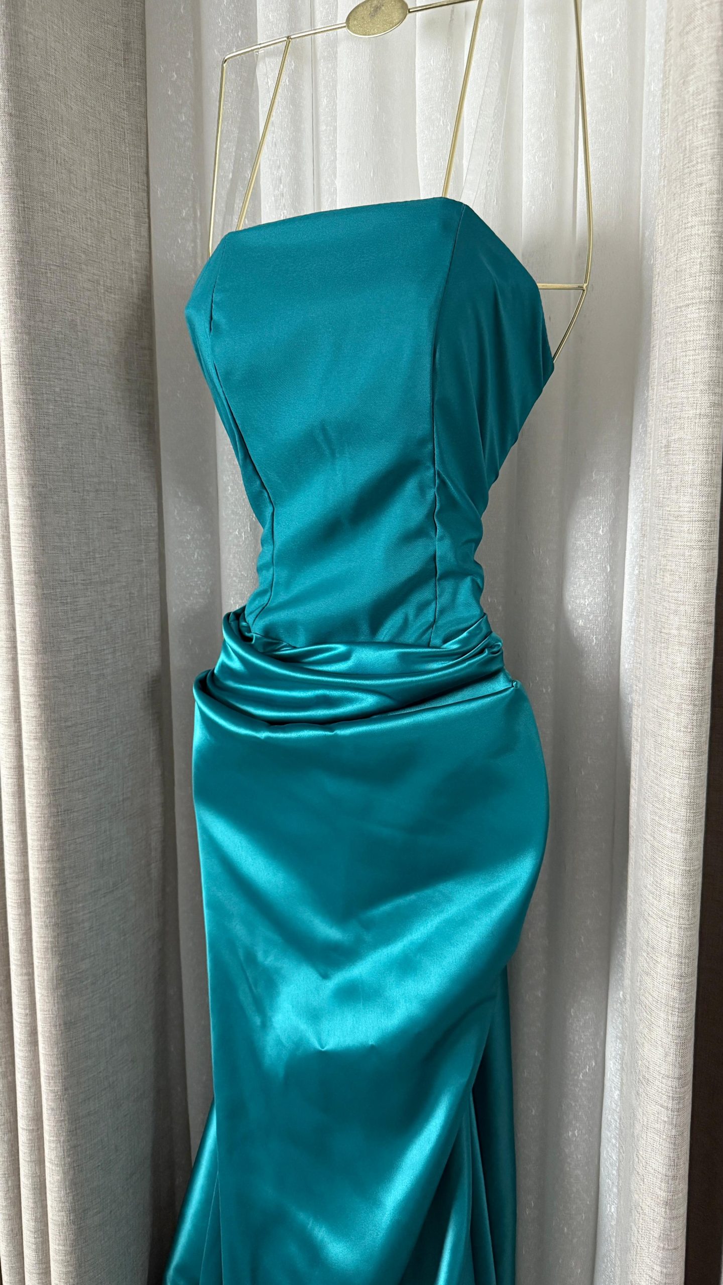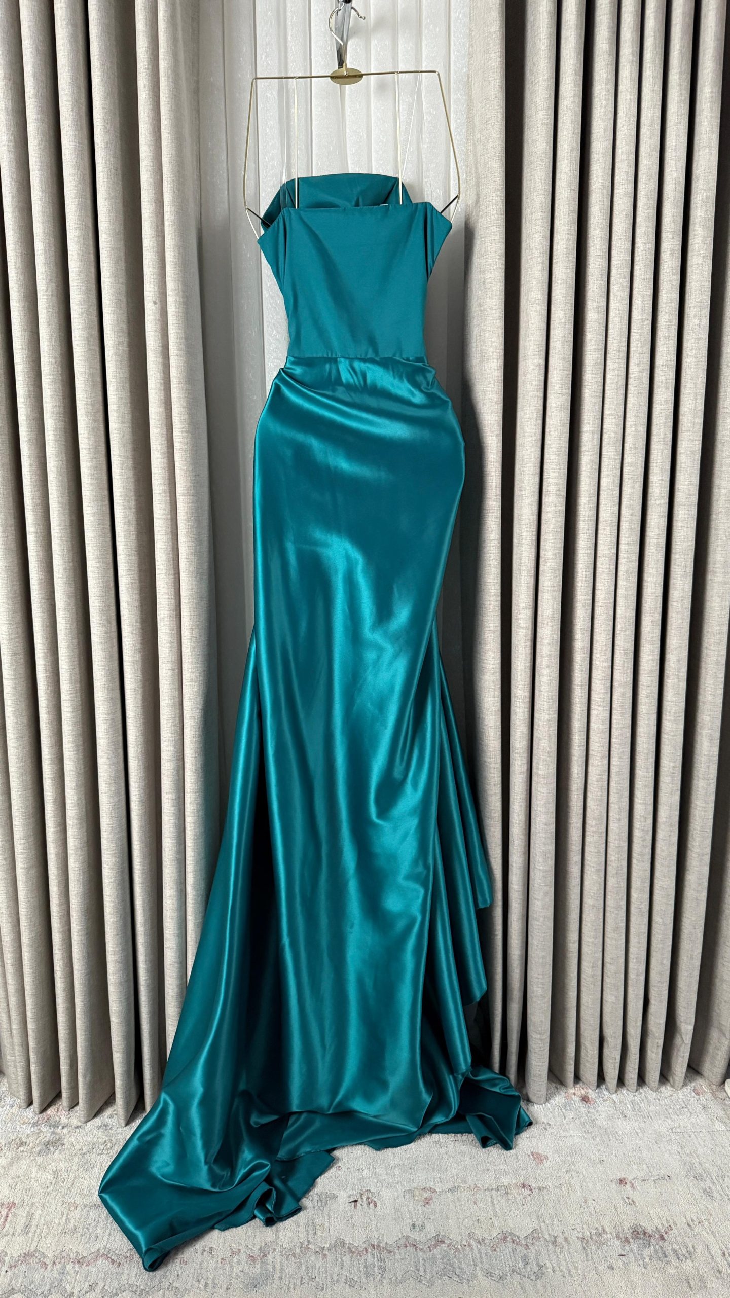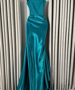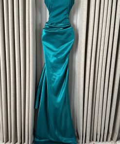 فستان سهرة راقٍ باللون التركواز اللامع، يتميز بقصة ناعمة وانسيابية مع تصميم كتف واحد يبرز الأنوثة والفخامة، مناسب للمناسبات الخاصة والحفلات الكبرى.