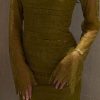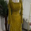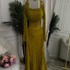 يأتي الفستان باللون التفاحي الراقي، وهو لون عصري يعكس الذوق الرفيع ويمنح إحساسًا بالفخامة والهدوء، كما يُعد من الألوان المميزة التي تناسب مختلف ألوان البشرة وتبرز جمال التصميم بشكل أنيق.