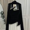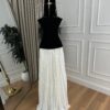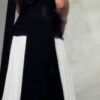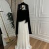 يتميز الجزء العلوي بقماش مخملي أسود فاخر بتفاصيل مطرزة براقة على الحواف تضيف لمسة من الرقي، بينما يأتي الجزء السفلي بتصميم حريري أبيض منسدل بطيات ناعمة تمنحك حركة أنثوية مفعمة بالجمال