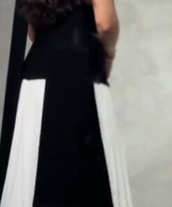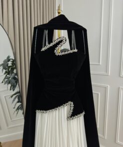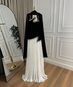 يتميز الجزء العلوي بقماش مخملي أسود فاخر بتفاصيل مطرزة براقة على الحواف تضيف لمسة من الرقي، بينما يأتي الجزء السفلي بتصميم حريري أبيض منسدل بطيات ناعمة تمنحك حركة أنثوية مفعمة بالجمال