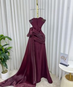 فستان سهرة خمري بتطريز لؤلؤي وأربطة على الخصر