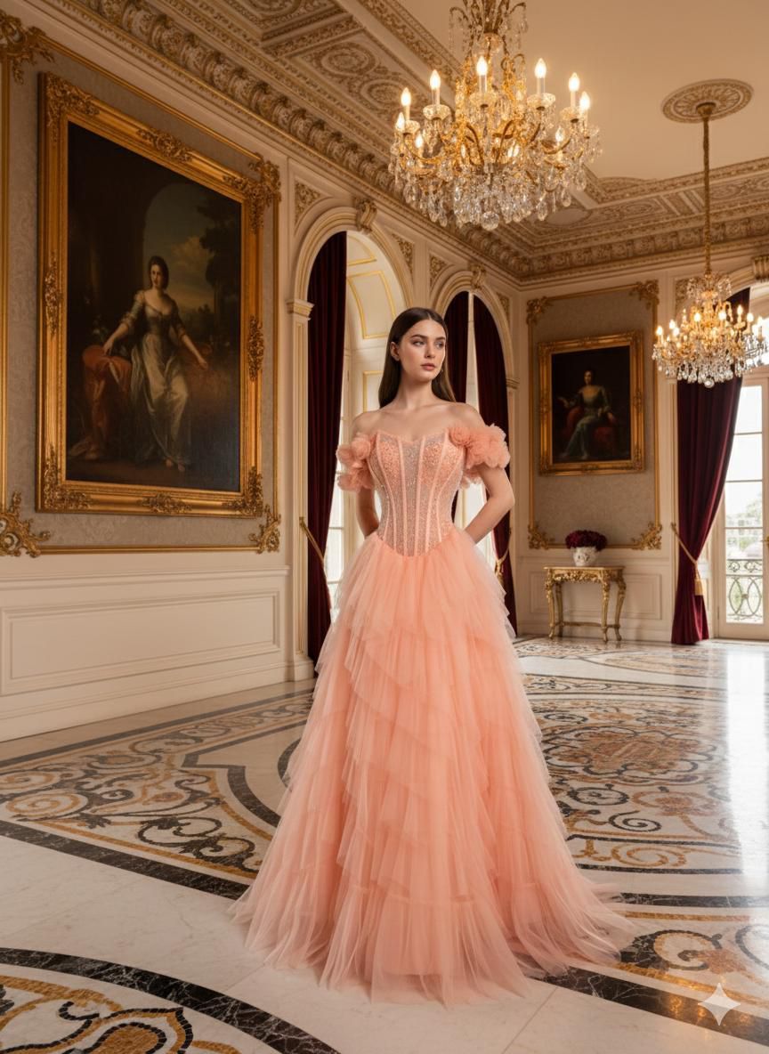 فستان سهرة خوخي بتصميم كورسيه وتنورة تول… أنوثة ناعمة بإطلالة فاخرة