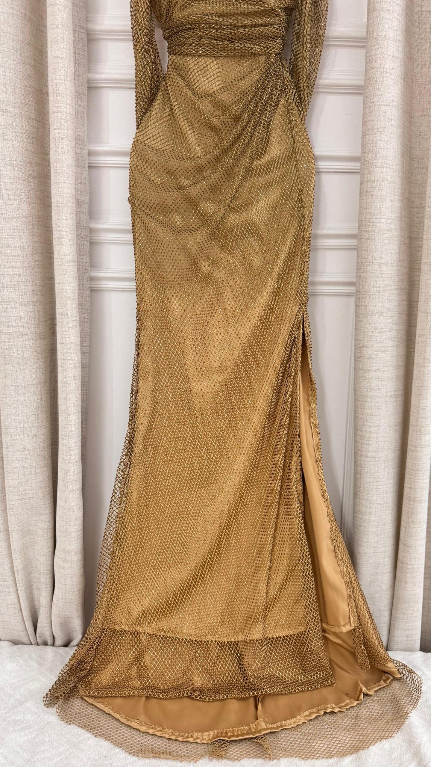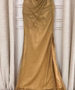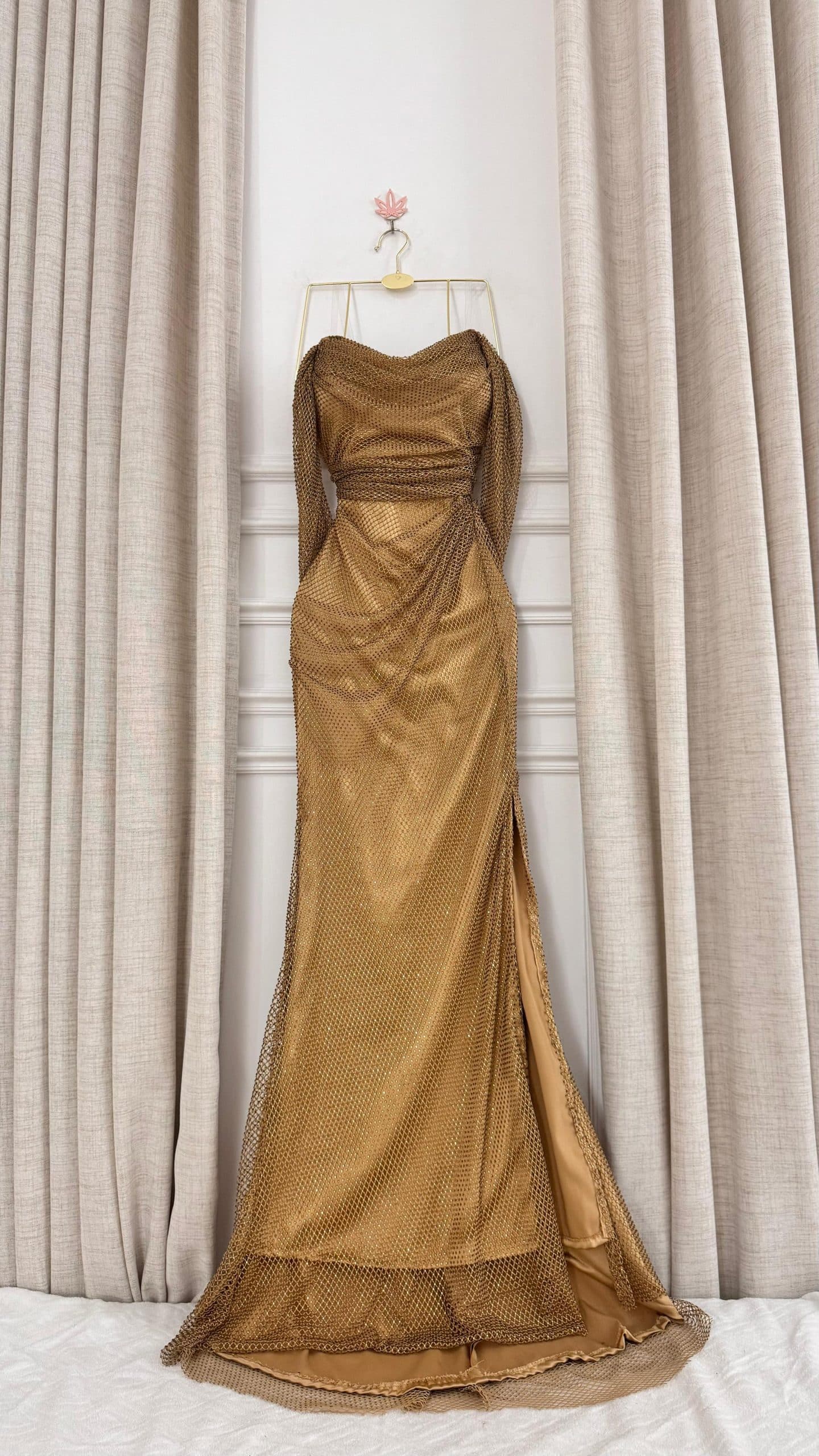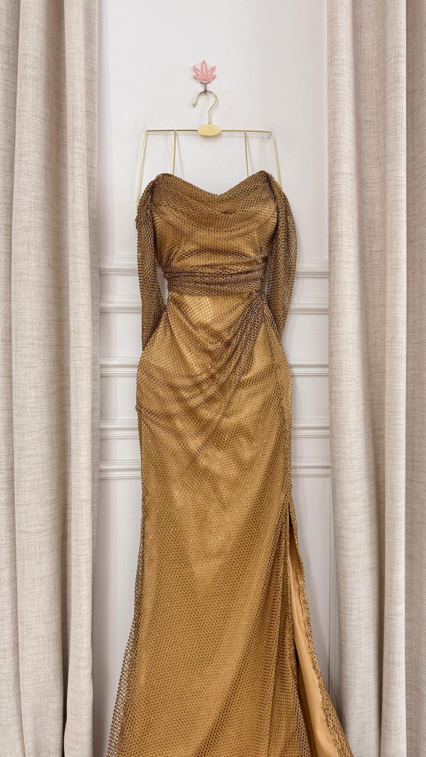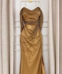 فستان سهرة ذهبي فاخر بفتحة ساق وأكتاف منسدلة