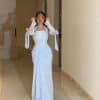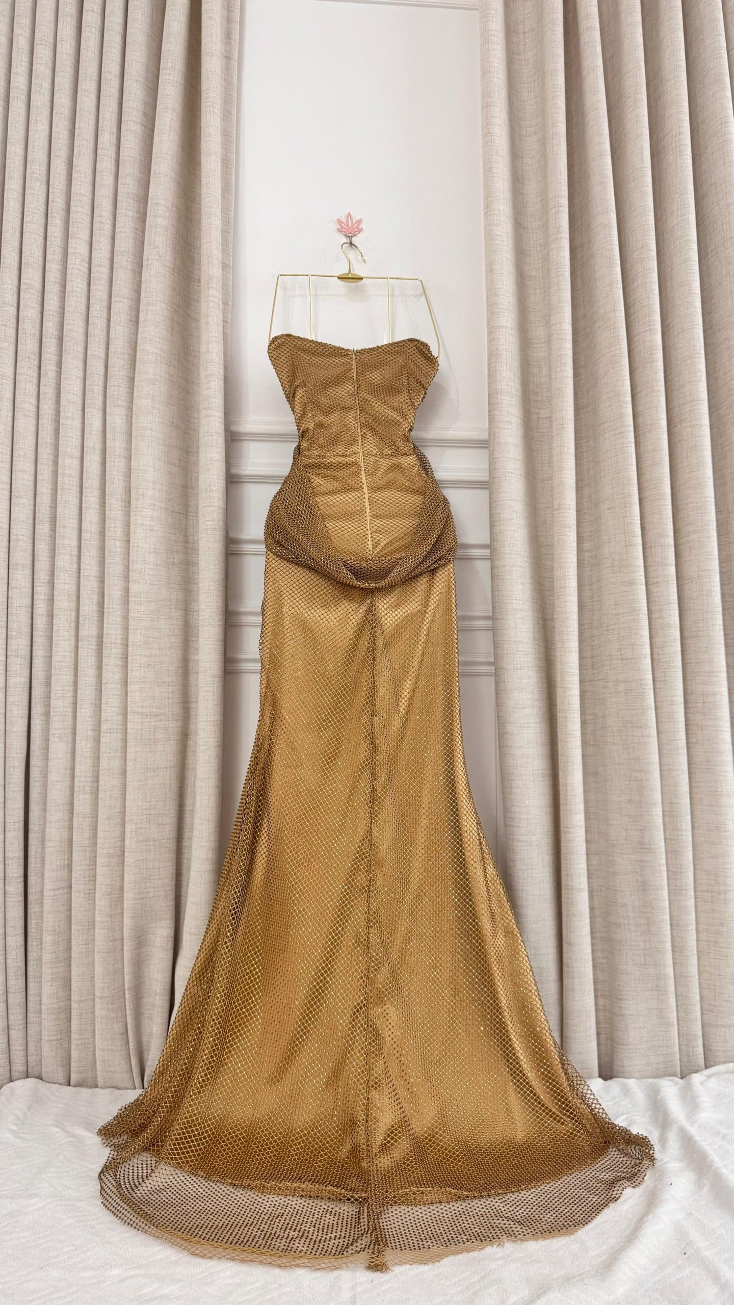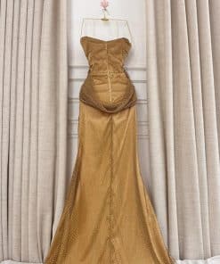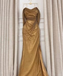 فستان سهرة ذهبي بتصميم ساحر يجمع بين الفخامة والجاذبية، مصنوع من قماش لامع مرصع بتفاصيل براقة تمنحك إطلالة ملفتة في كل مناسبة. يتميز بقصة محددة للخصر تبرز جمال القوام مع تنورة طويلة انسيابية وفتحة ساق أنيقة تضيف لمسة أنثوية جذابة.