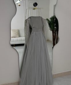 فستان سهرة رمادي فاخر بتفاصيل لؤلؤية