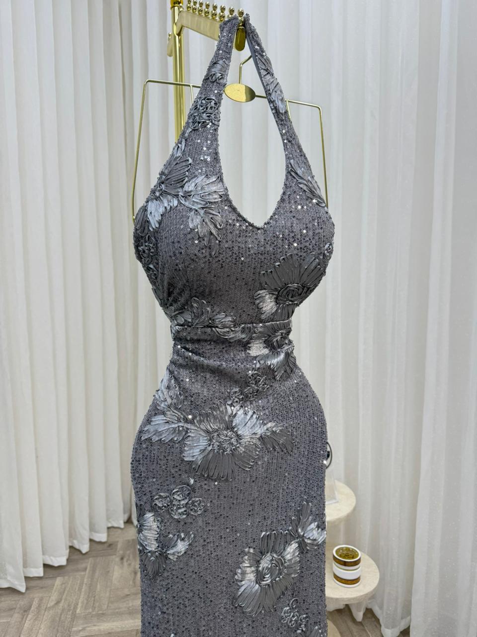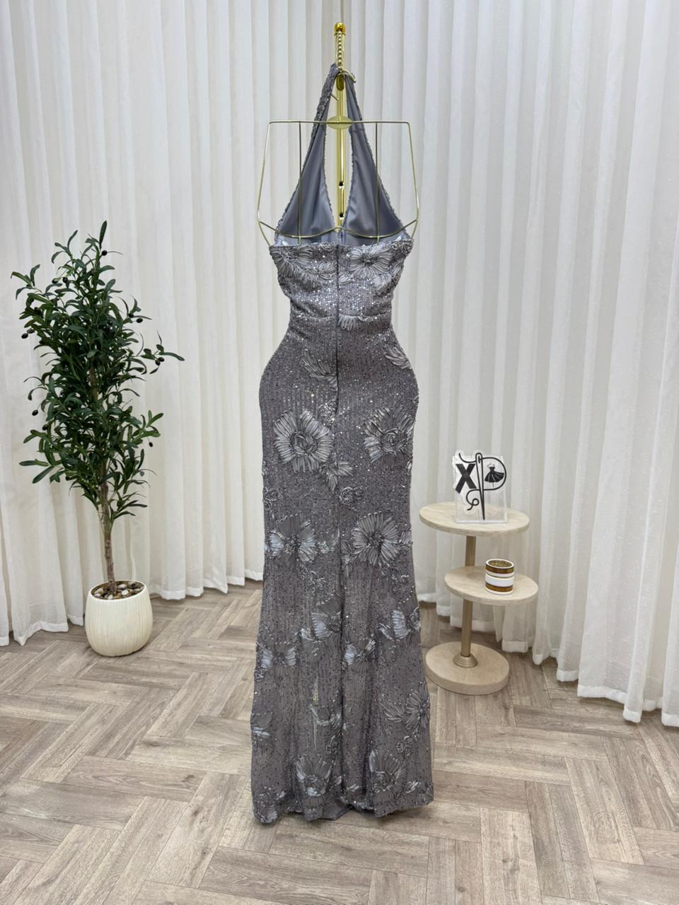 فستان سهرة رمادي فاخر بتطريز زهور لامعة وتصميم هالتر أنيق يبرز القوام بجاذبية، مثالي للحفلات والمناسبات الراقية بإطلالة أنثوية جذابة.