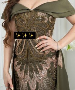 إذا كنتِ تبحثين عن إطلالة تُجسّد الفخامة والرقي في آنٍ واحد، فإن هذا الفستان الزيتوني الملكي هو خيارك الأمثل. يجمع التصميم بين النعومة والجرأة بأسلوب متوازن، حيث يأتي الفستان بقصة ضيقة مطرّزة بالكامل برسومات ذهبية ولمعان ناعم يعكس الإضاءة ببراعة، مما يضيف طابعًا ساحرًا لكل حركة.