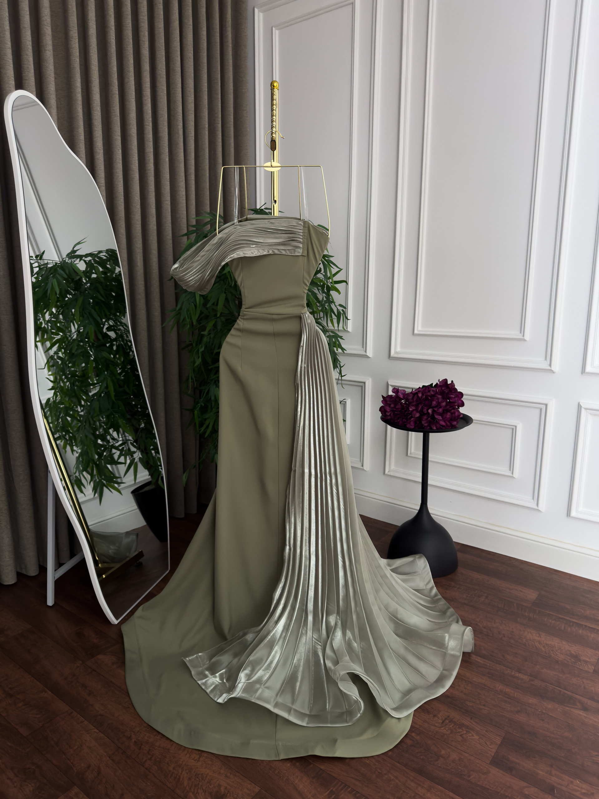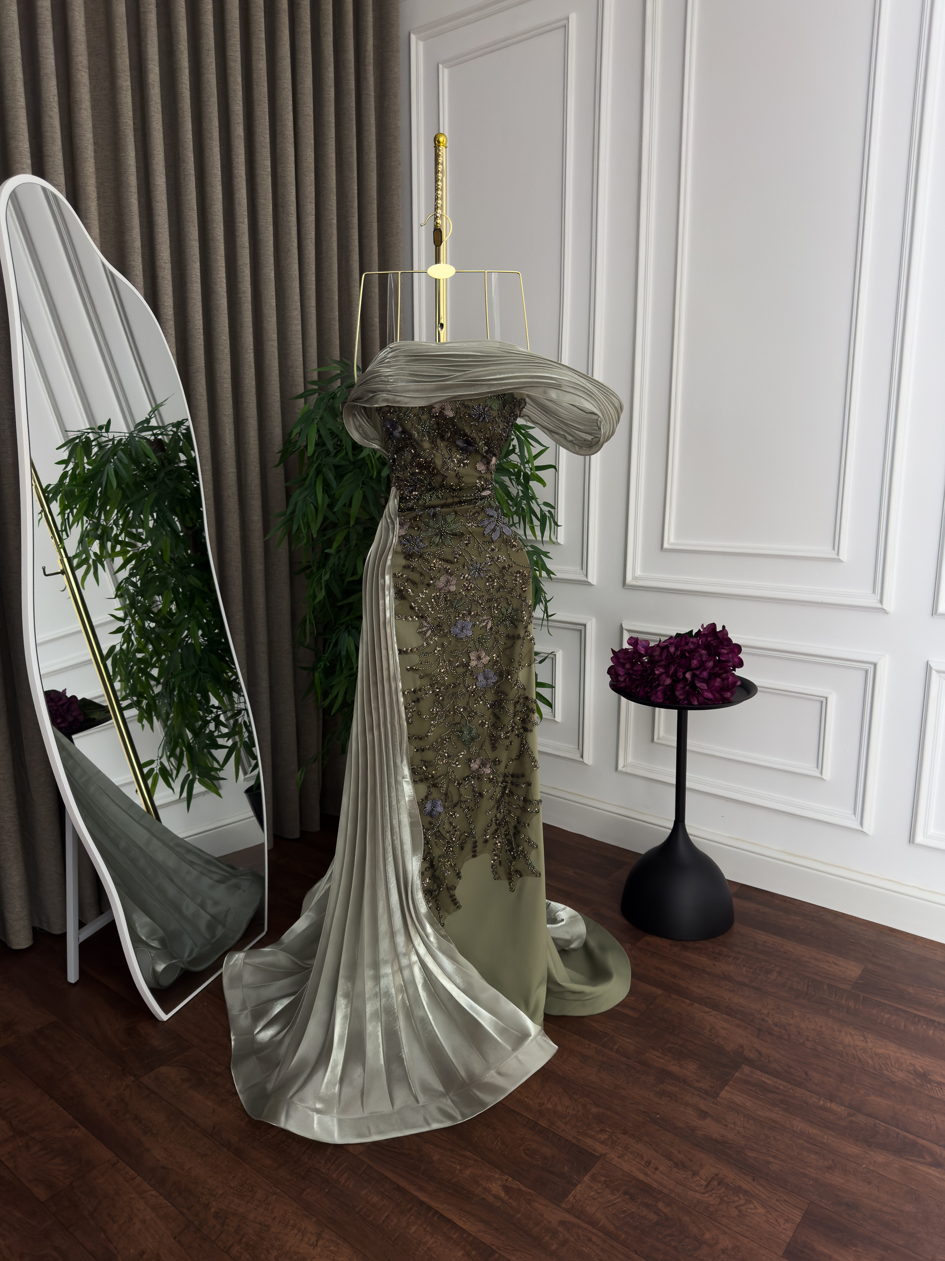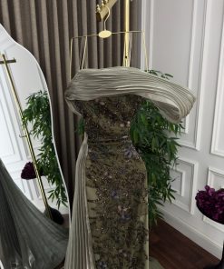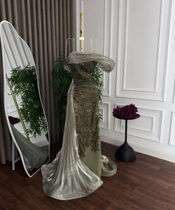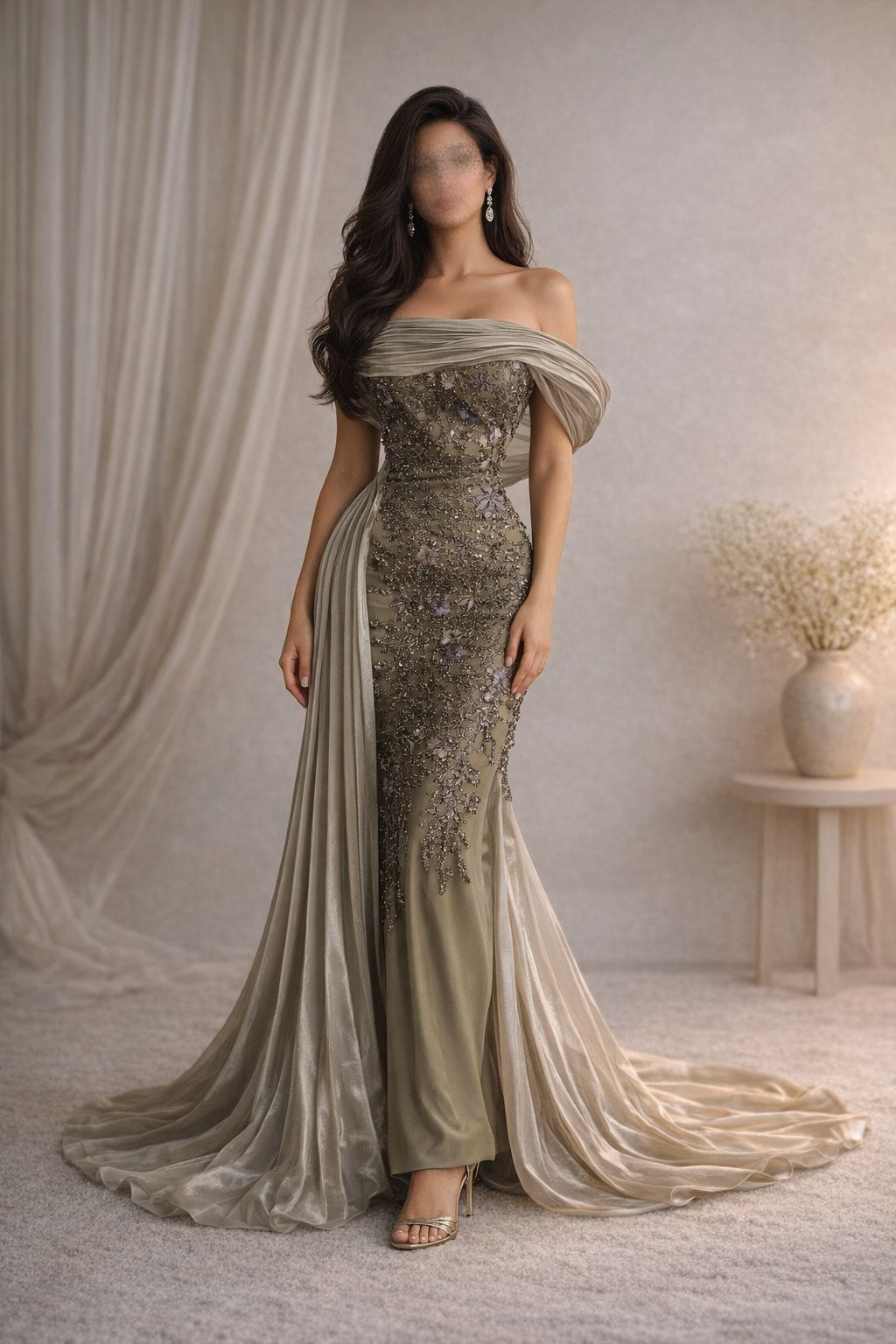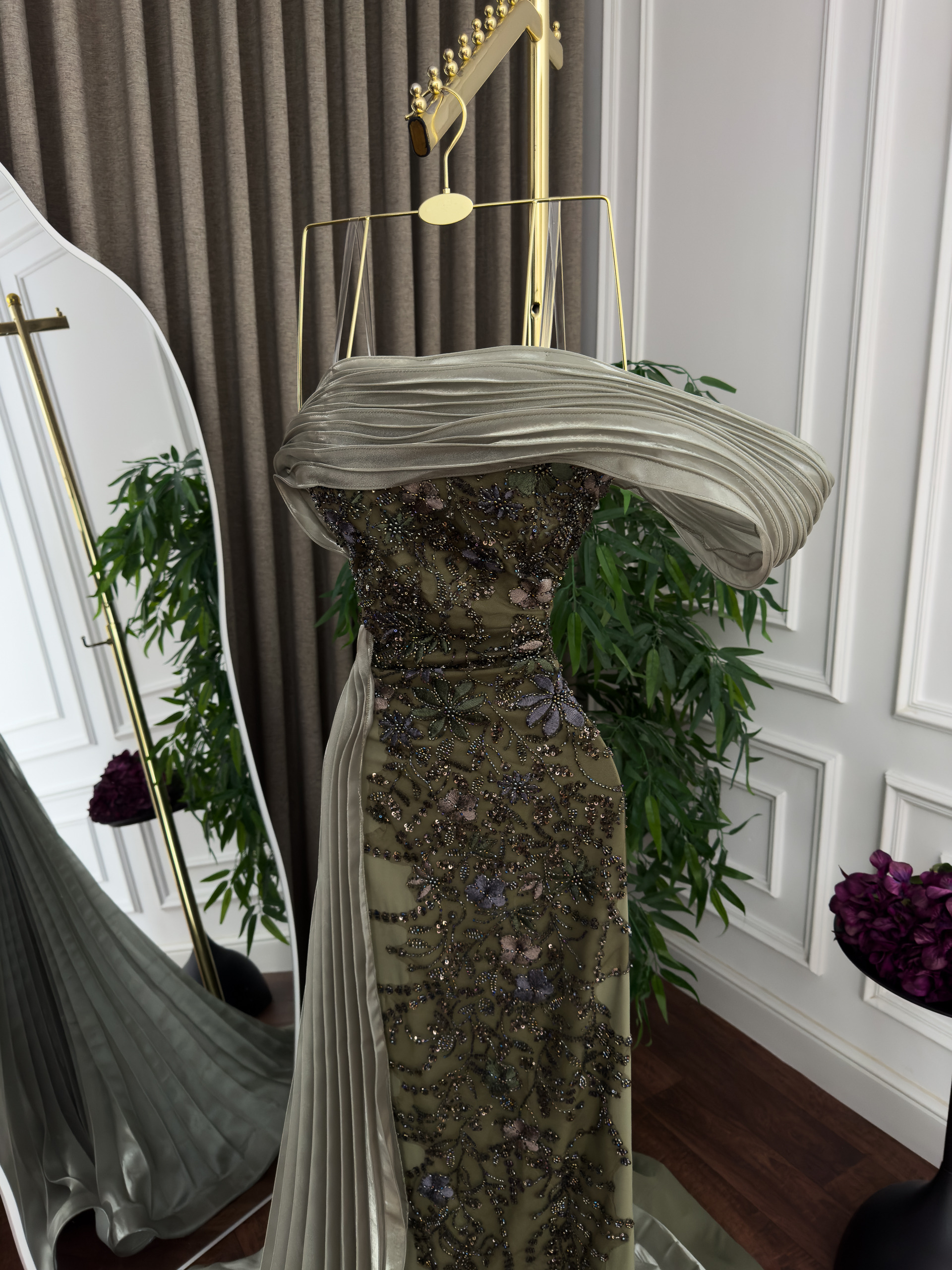 فستان سهرة زيتي فاخر بتطريز لامع وكاب ساتان أنيق – متجر روزيتا السعودية