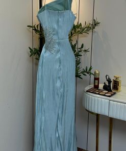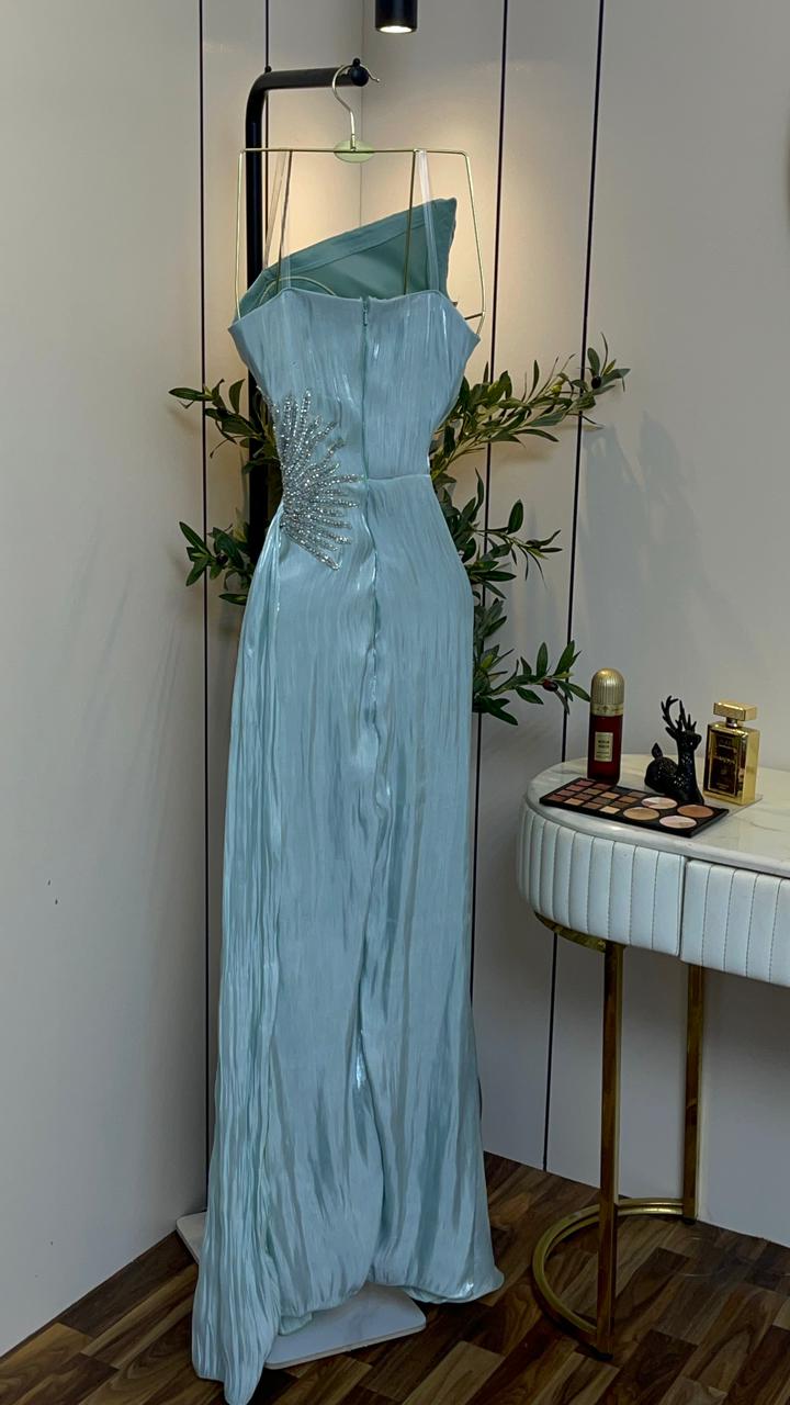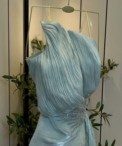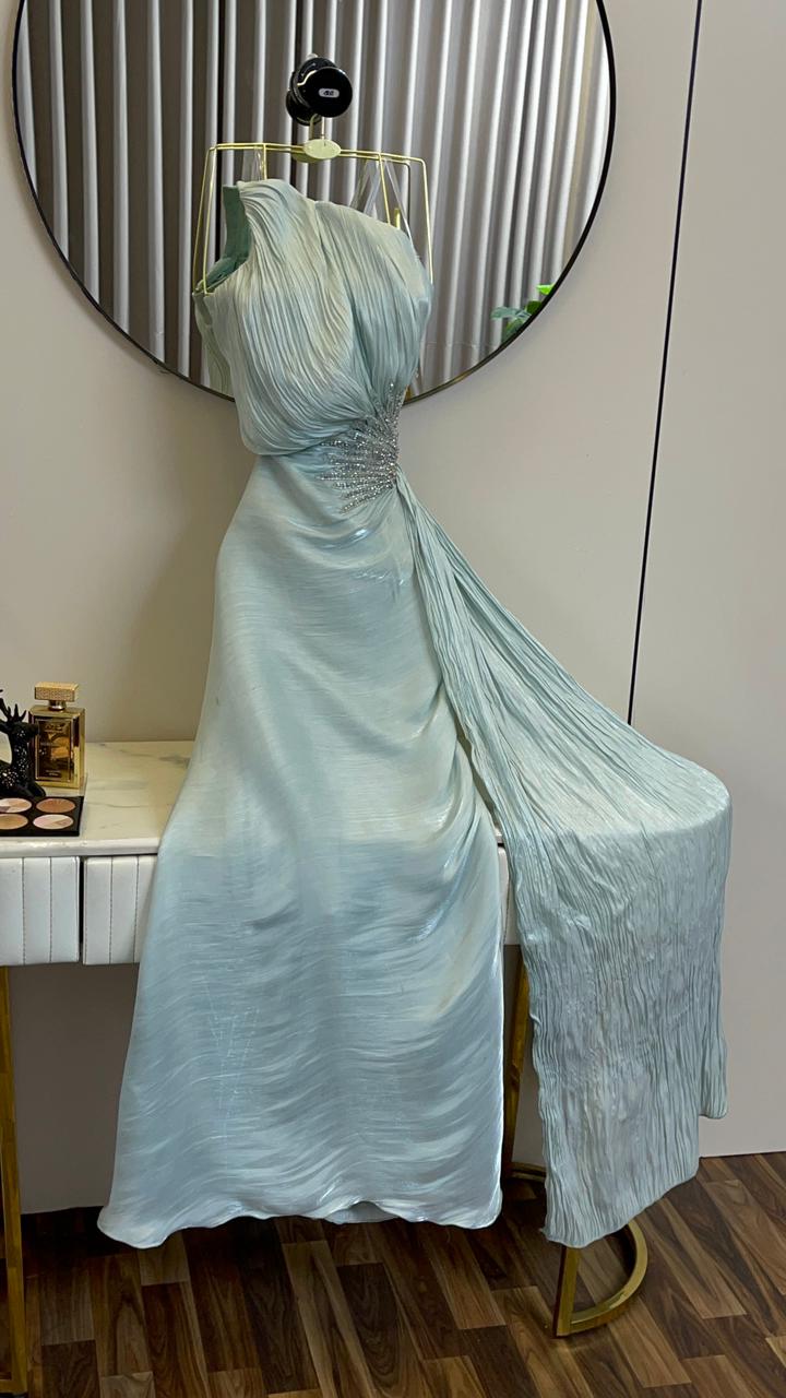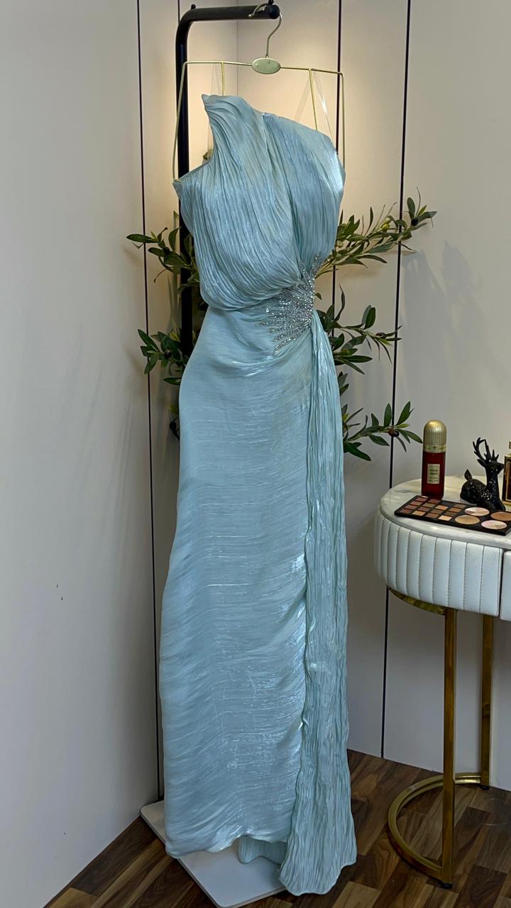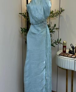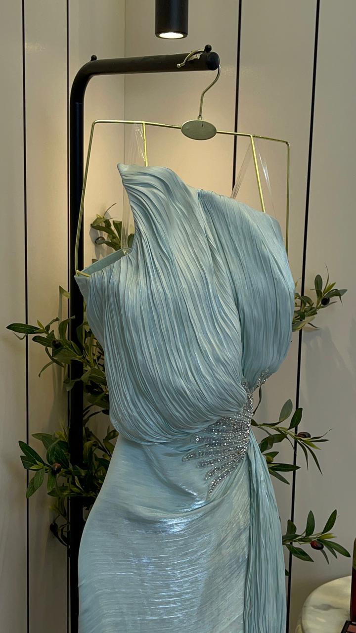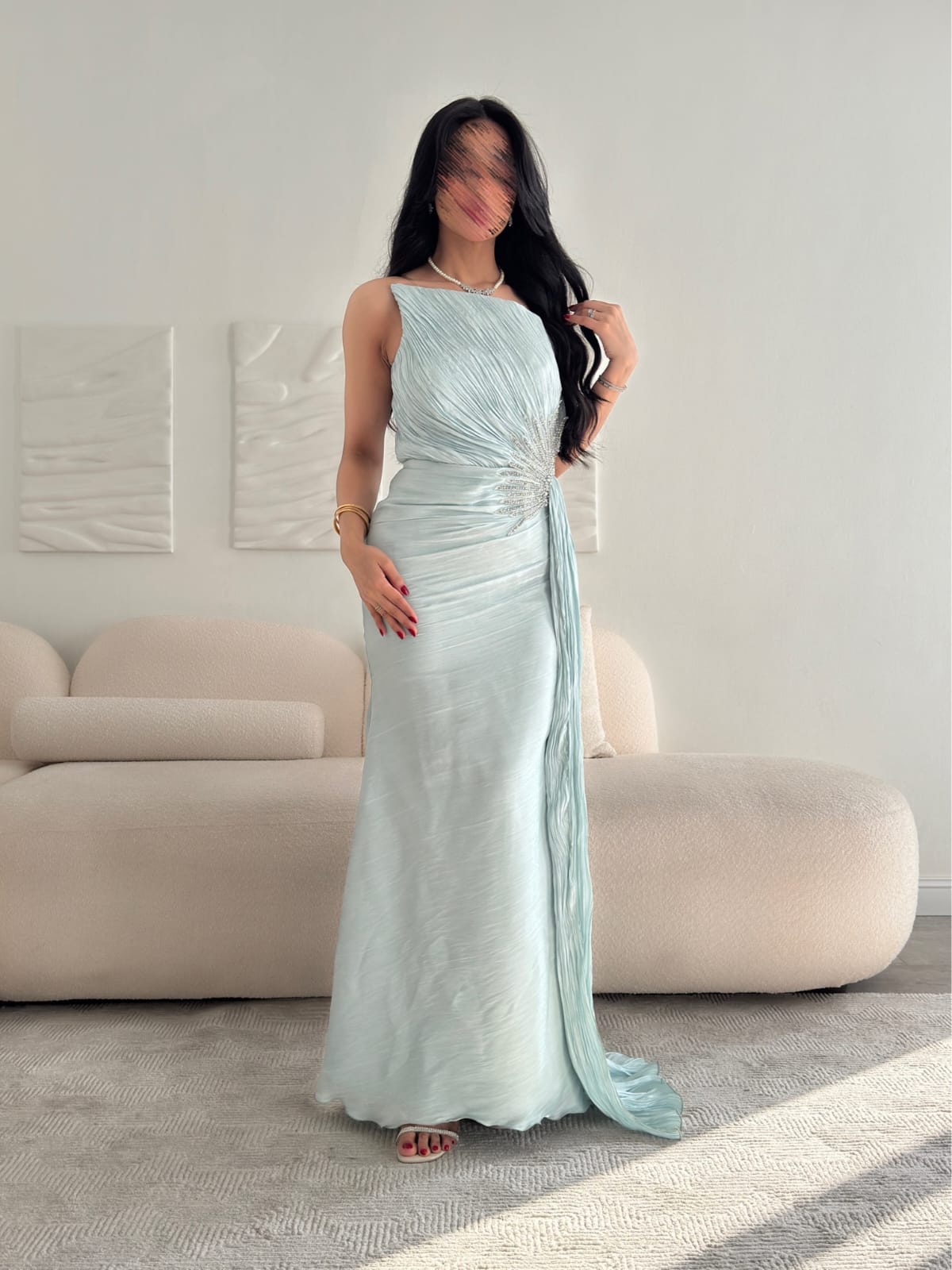 فستان سهرة سماوي فاخر بتصميم كتف واحد وتفاصيل درابيه – متجر روزيتا السعودية