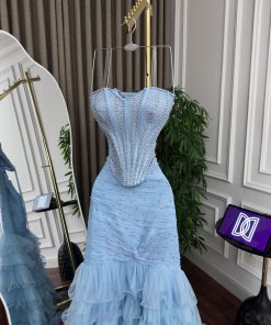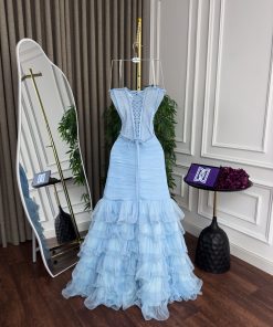 فستان سهرة سماوي منفوش بتطريز فاخر وقصة ميرميد أنيقة