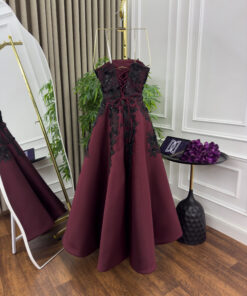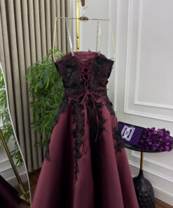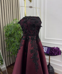 فستان فاخر العنابي (الخمري)، يتميز بملابس أنيقة. الجزء العلوي من القماش المطرز بتطريزات شفافة فاخرة من الحرير الأسود يرسم جرافيتي ورسومات جرافيكية، مما يتحمل عبء طابعه الرائع وجذابًا.