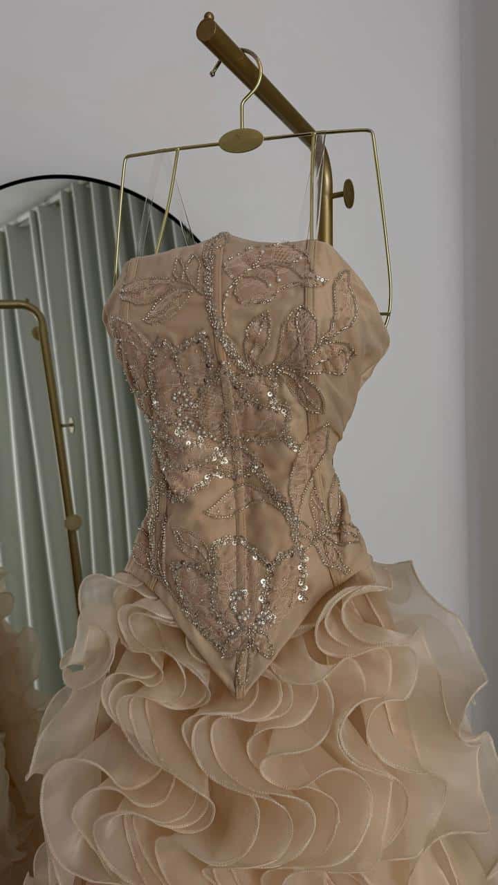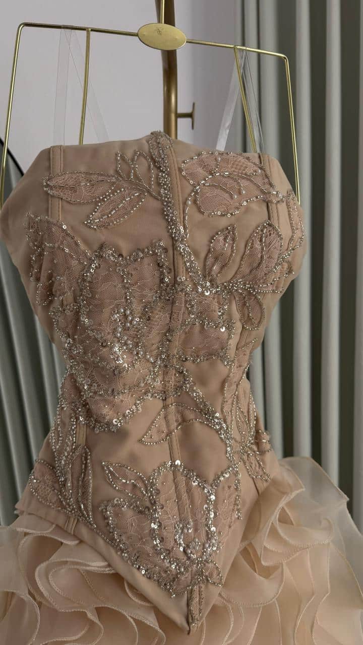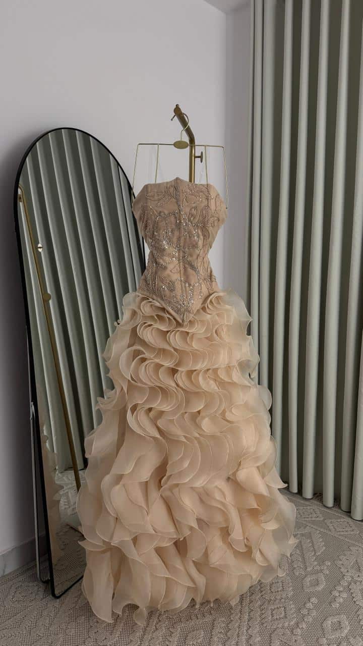 فستان سهرة فاخر بلون شامبين راقٍ يجمع بين الفخامة والأنوثة في تصميم يخطف الأنظار. يتميز الجزء العلوي بقصة كورسيه أنيقة مزينة بتطريزات لامعة وخرز فاخر يمنح الفستان لمسة ملكية جذابة.