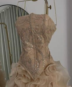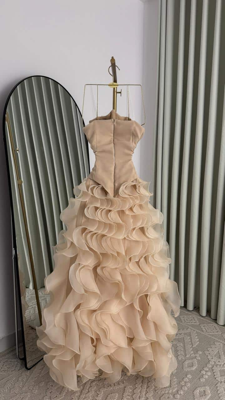 فستان سهرة شامبين فاخر بطبقات كشكش وتطريز لامع