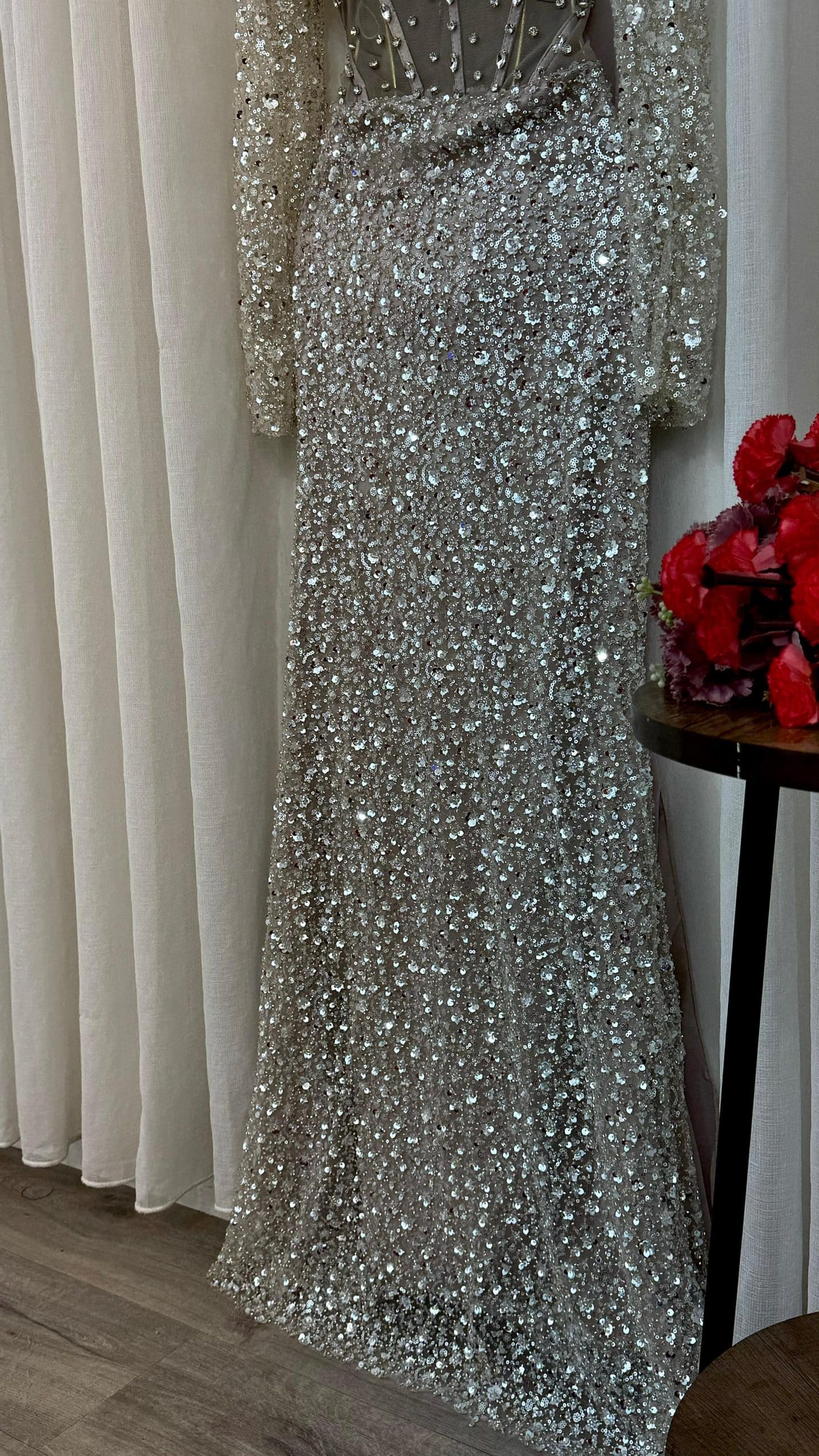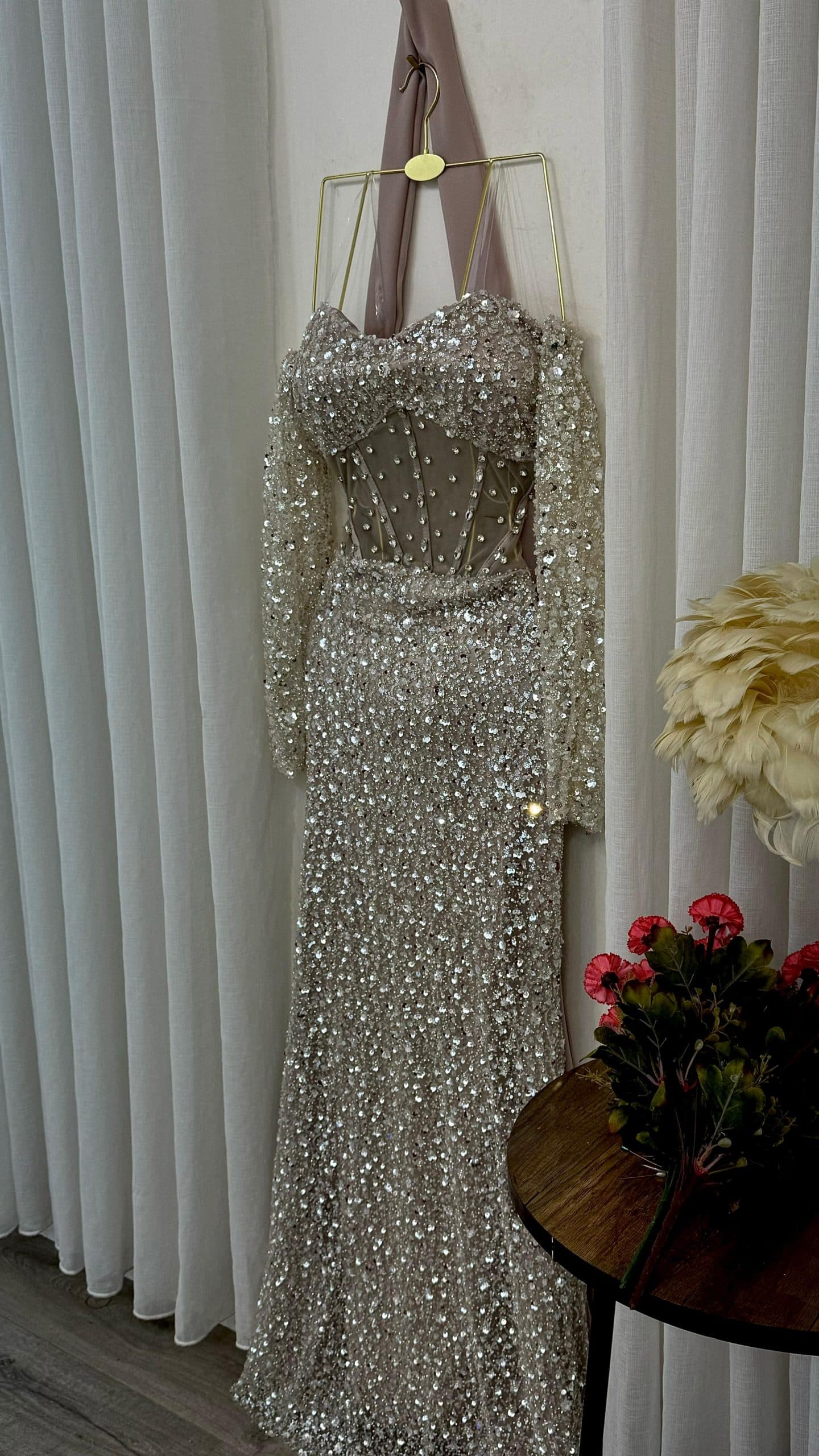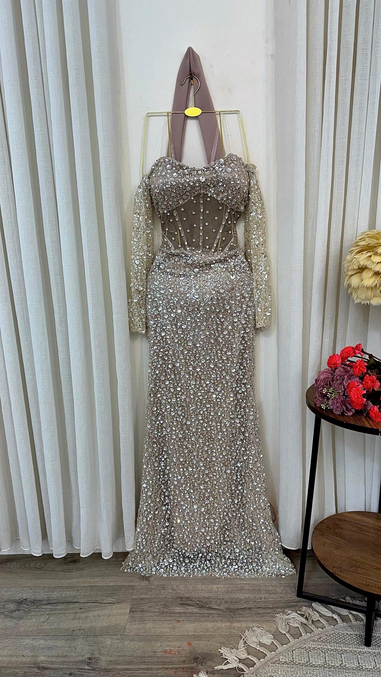 تألقي بإطلالة فخمة لا تُنسى مع هذا الفستان الشامبين الراقي المصمم بعناية ليبرز أنوثتك بأسلوب ملكي. يتميز بتطريز فاخر بالكامل مع قصة ضيقة تبرز القوام، وأكمام شفافة تضيف لمسة أنيقة وجذابة. التصميم يجمع بين الفخامة والنعومة، ما يجعله خيارًا مثاليًا لحفلات الزفاف والسهرات والمناسبات الخاصة في السعودية.