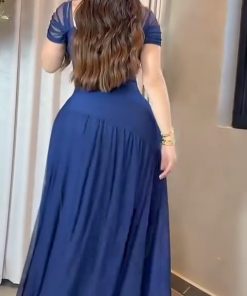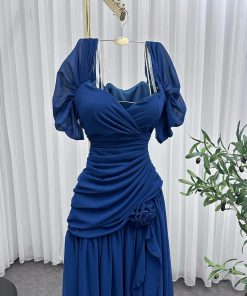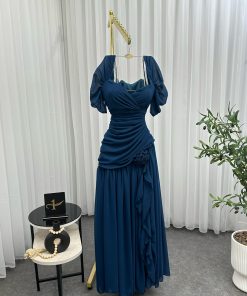 فستان سهرة أنيق باللون الأزرق الداكن، يتميز بتصميم كلاسيكي راقٍ. يأتي بقصة ضيقة عند الخصر لإبراز القوام، مع تصميم كروس (ملتف) عند منطقة الصدر يعزز الأنوثة. يتميز بأكمام قصيرة شفافة قليلاً، مما يمنحه لمسة ناعمة وأنيقة.
