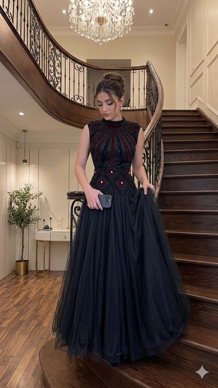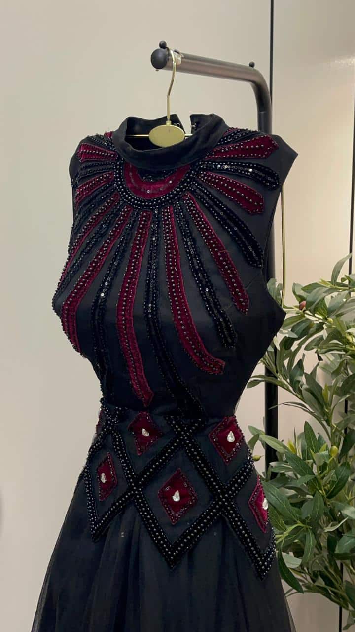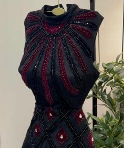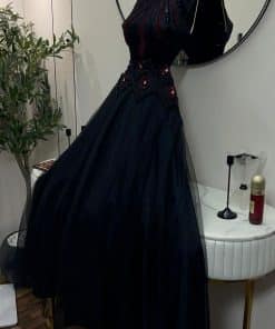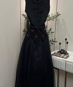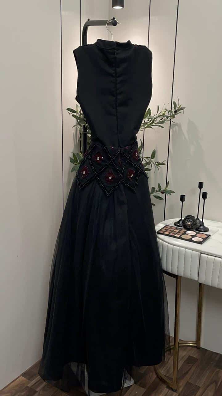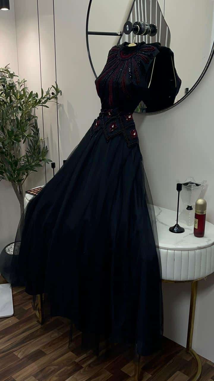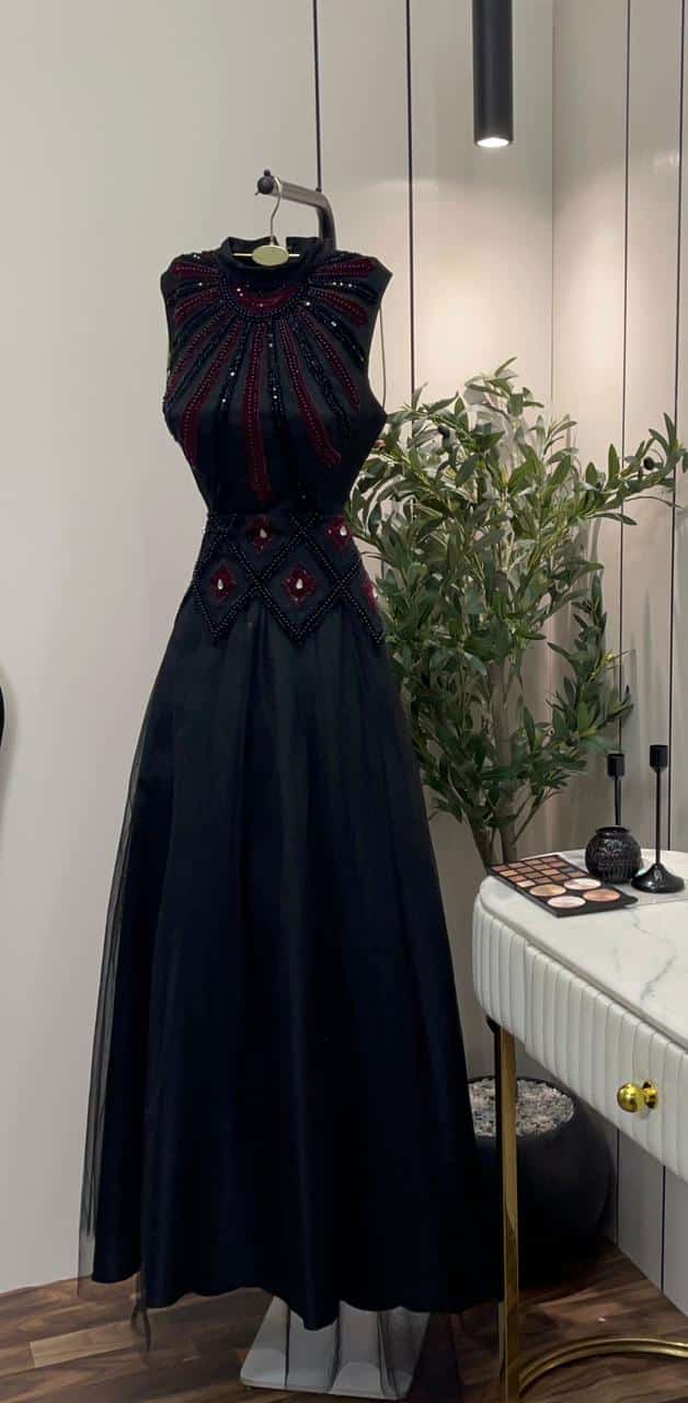 فستان سهرة طويل أسود تصميم أنيق مطرز