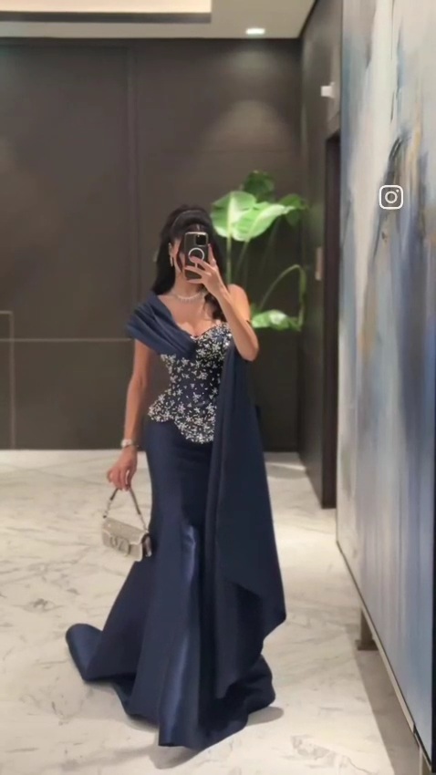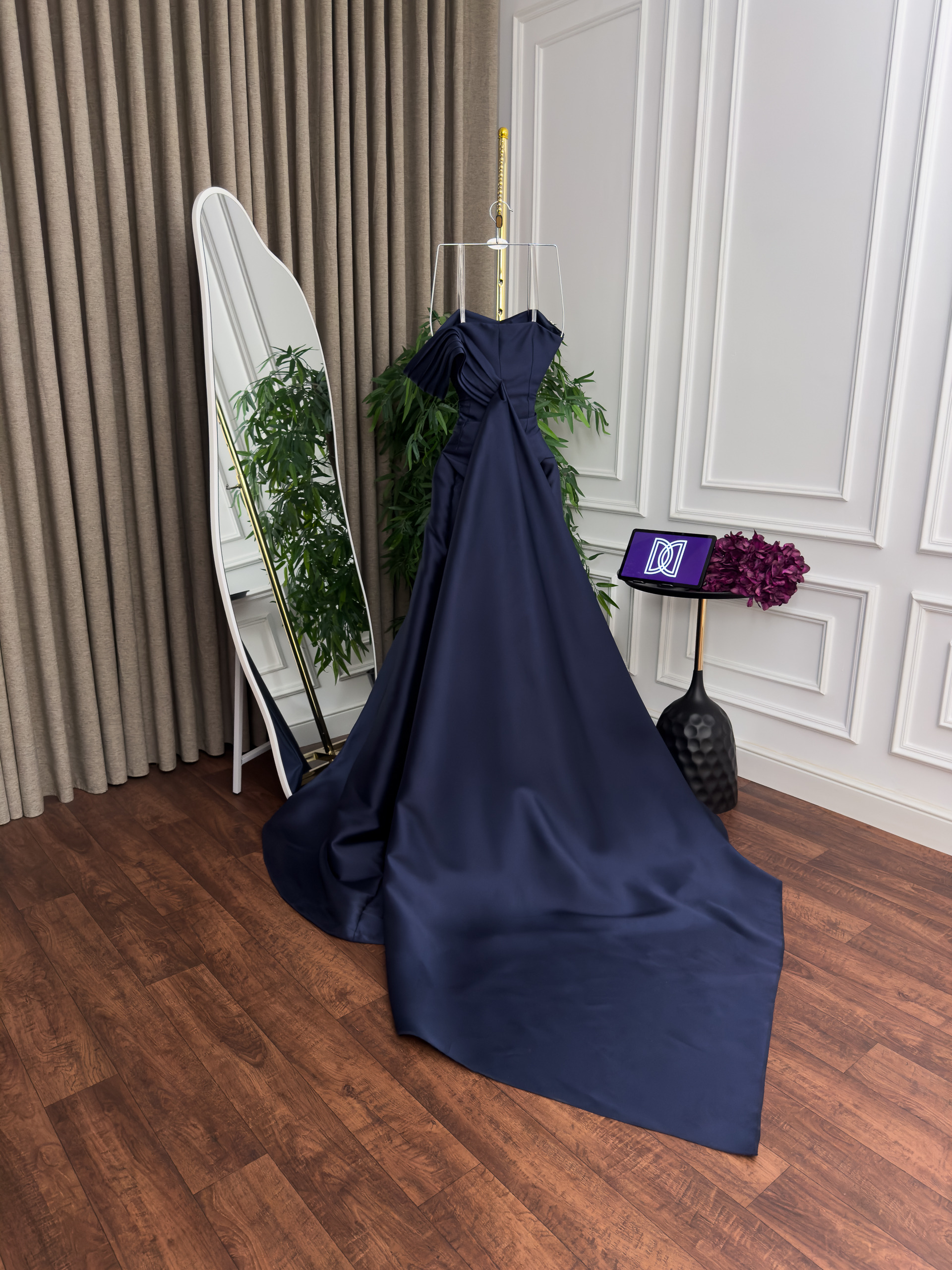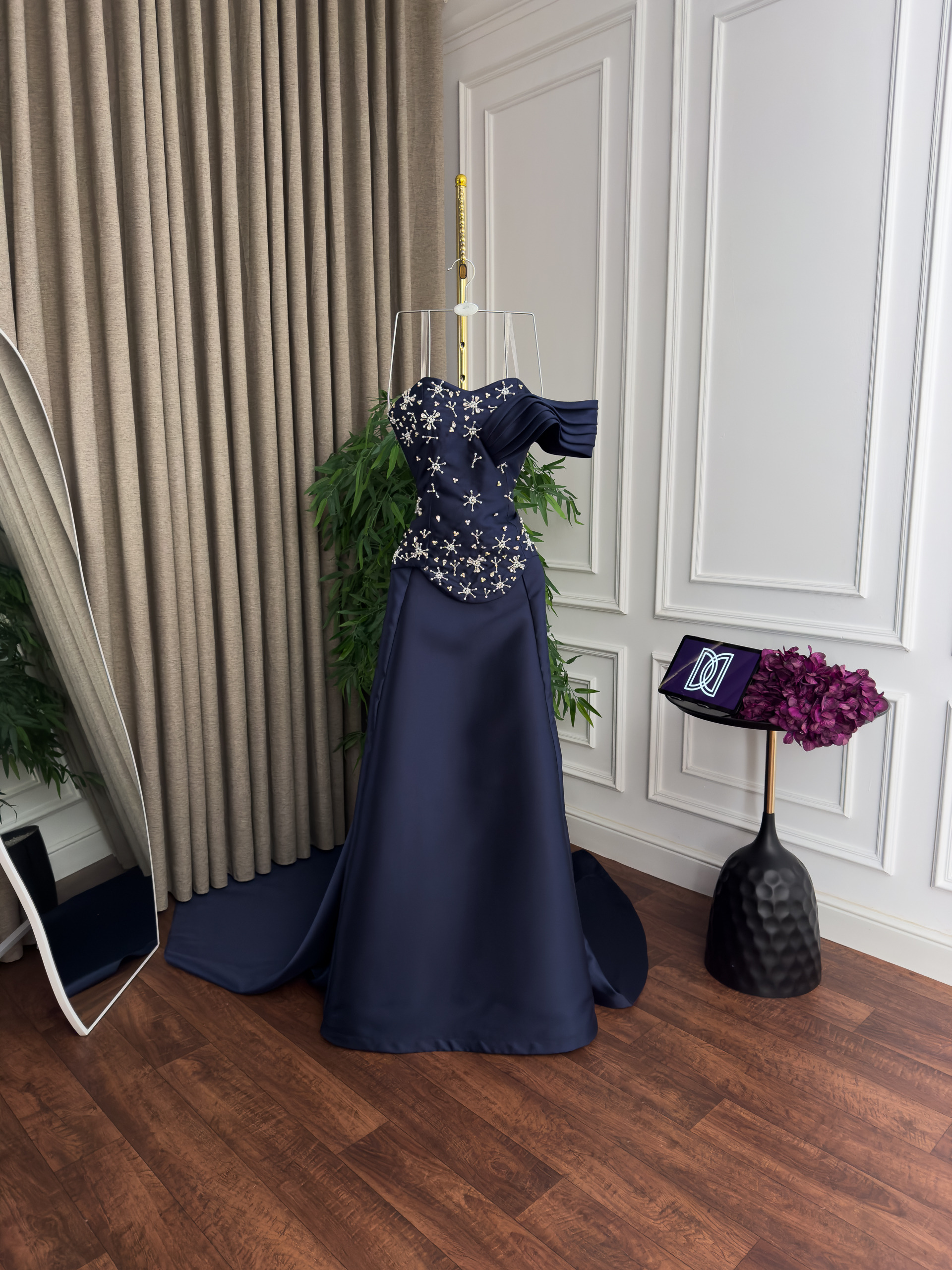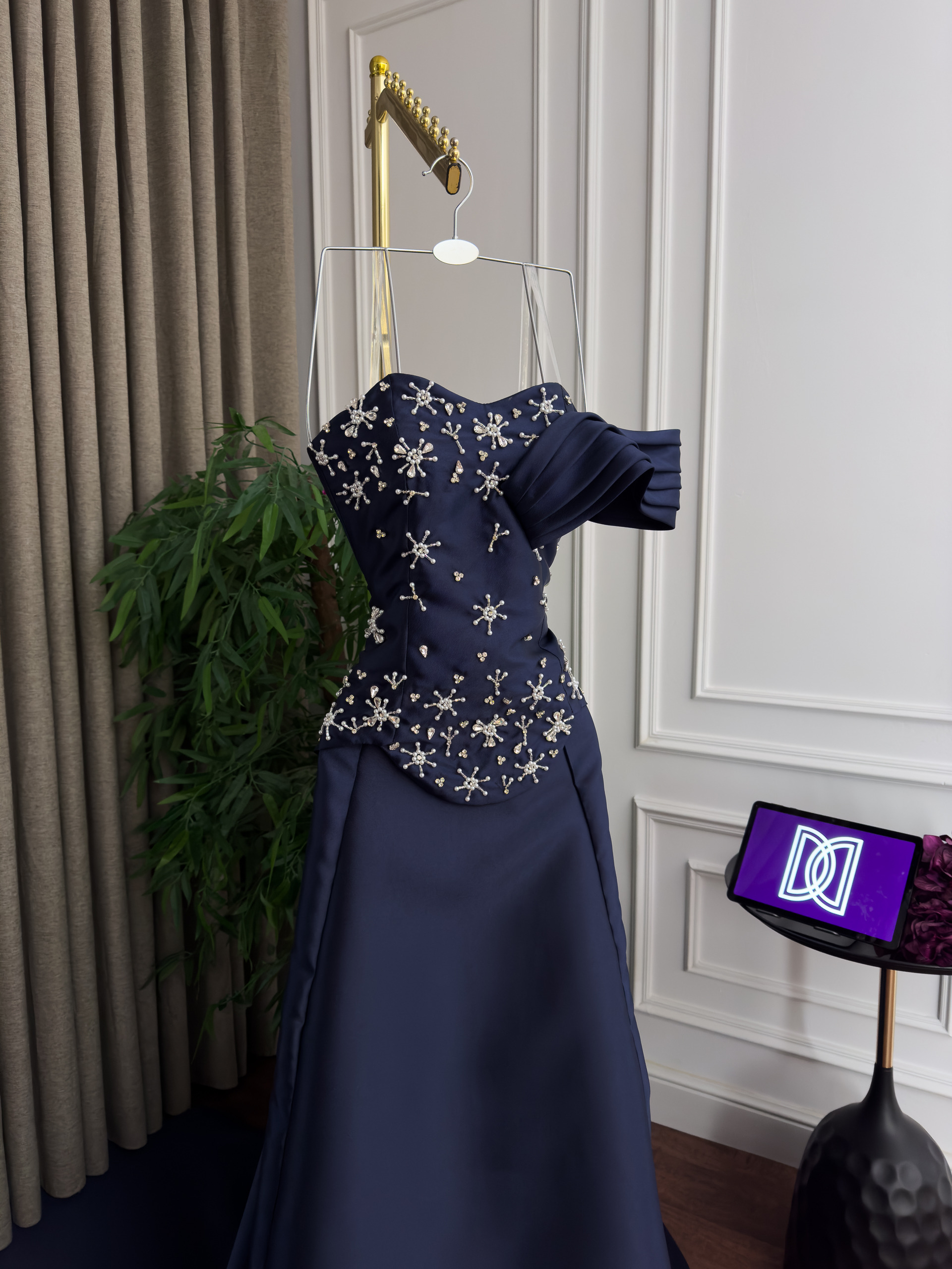 تم تصميم هذا الفستان بعناية فائقة ليتناسب مع كافة أنواع المناسبات، سواء كانت حفلات زفاف، أو مناسبات رسمية، أو سهرات خاصة. الفستان يأتي بلون أزرق داكن جذاب، ومزود بتفاصيل زينة لامعة على الصدر، مما يضفي لمسة فاخرة تميزك عن الآخرين. تنسيق الأقمشة الدقيقة والتفاصيل الدقيقة في التصميم يجعل هذا الفستان الخيار المثالي لكل من تبحث عن إطلالة أنيقة ومميزة.