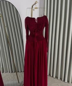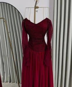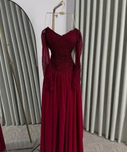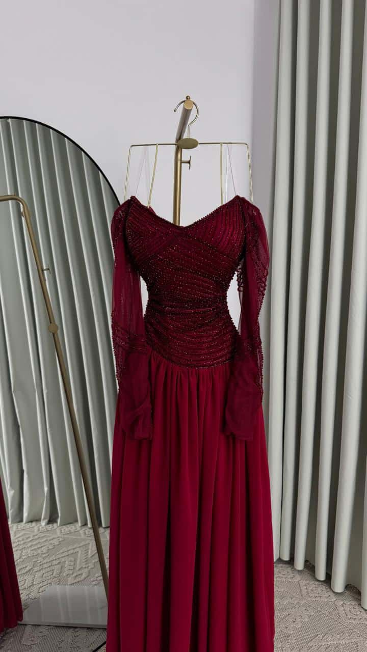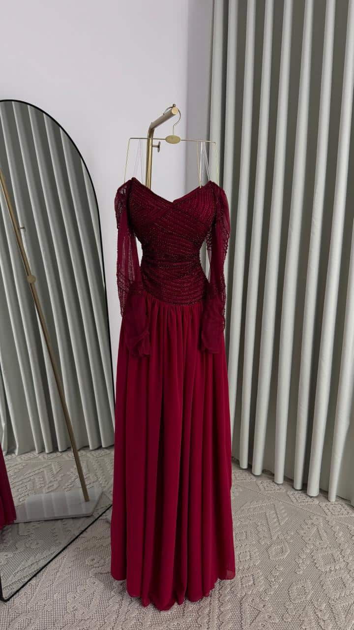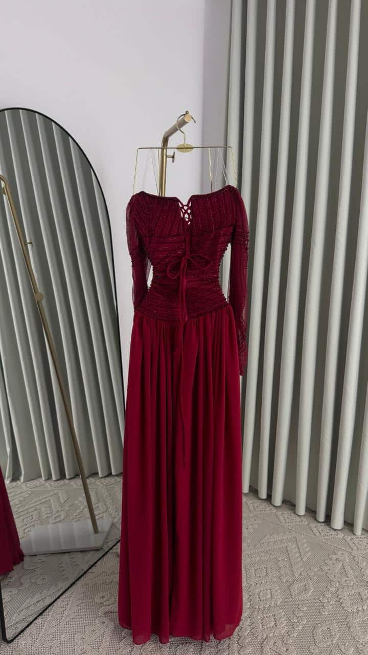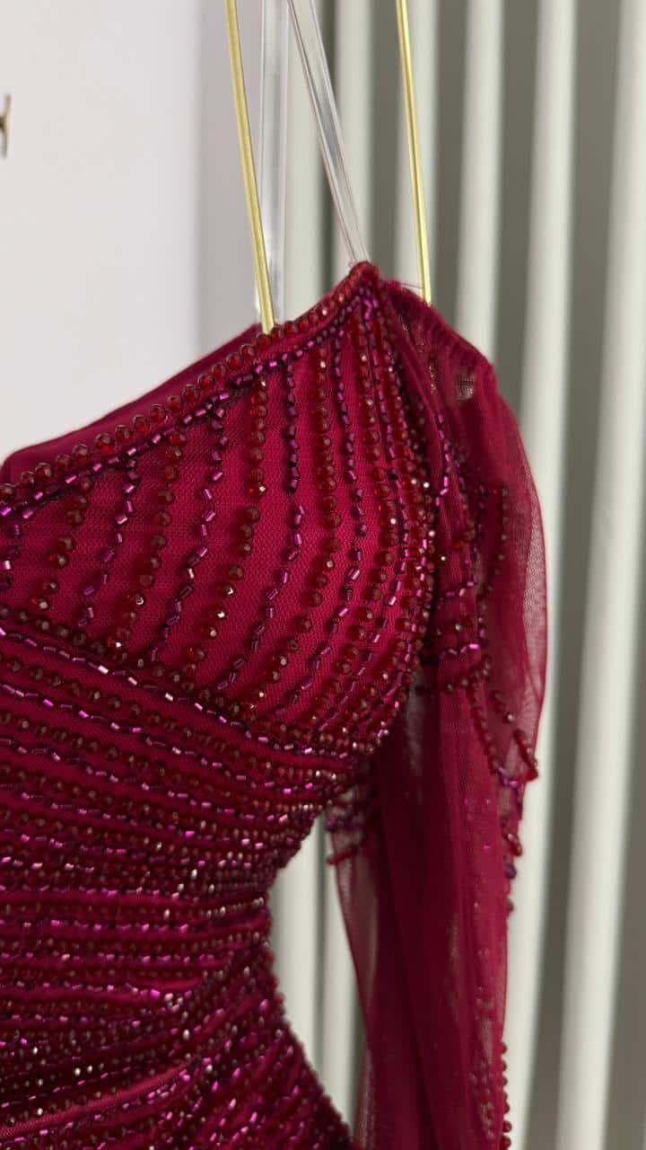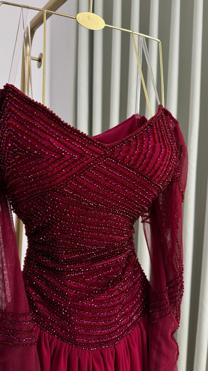تألقي بإطلالة أنثوية راقية مع هذا الفستان الأحمر الطويل المصمم ليمنحك حضورًا فخمًا في السهرات والمناسبات الخاصة. يتميز الفستان بجزء علوي مطرز بتفاصيل لامعة على شكل خطوط متداخلة تضيف بريقًا ناعمًا وفخامة واضحة، مع قصة صدر أنيقة تمنح التصميم لمسة جذابة ومتوازنة.