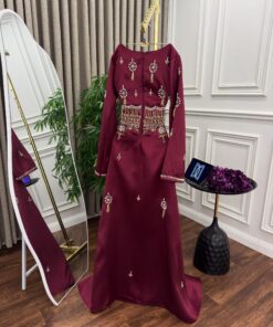 من متجر روزيتا السعودي نُقدّم لكِ هذا الفستان الفخم بلونه الخمري العميق الذي يجمع بين الرقي والأصالة. يتميز التصميم بالتطريز اليدوي الذهبي اللامع الذي يزين الصدر والخصر والأكمام بأسلوب راقٍ يعكس الفخامة العربية الأصيلة. إنه الاختيار المثالي لكل امرأة تبحث عن إطلالة ملكية ساحرة في المناسبات والسهرات الخاصة.