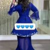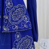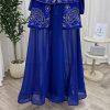 الفستان يتميز بتصميمه المميز حيث يبرز اللون الأزرق الملكي في كل تفاصيله. الجزء العلوي مزخرف بتطريزات خرزية أنيقة تزين المنطقة الأمامية والخلفية، مما يضيف لمسة من الفخامة ويجعل الفستان مثاليًا للمناسبات الخاصة. الطبقات التي تتدلى على الجانبين تضيف طابعًا من التميز والابتكار، مما يجعله فستانًا مختلفًا عن أي فستان آخر.