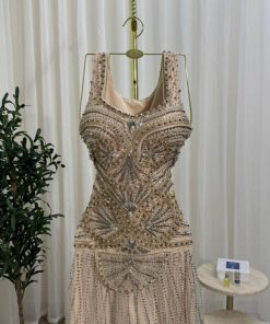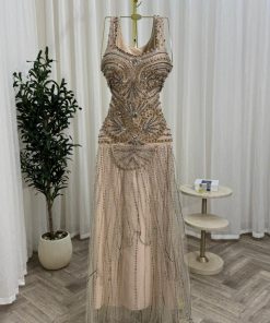 فستان سهرة طويل مطرز بالخرز لون شامبين فاخر